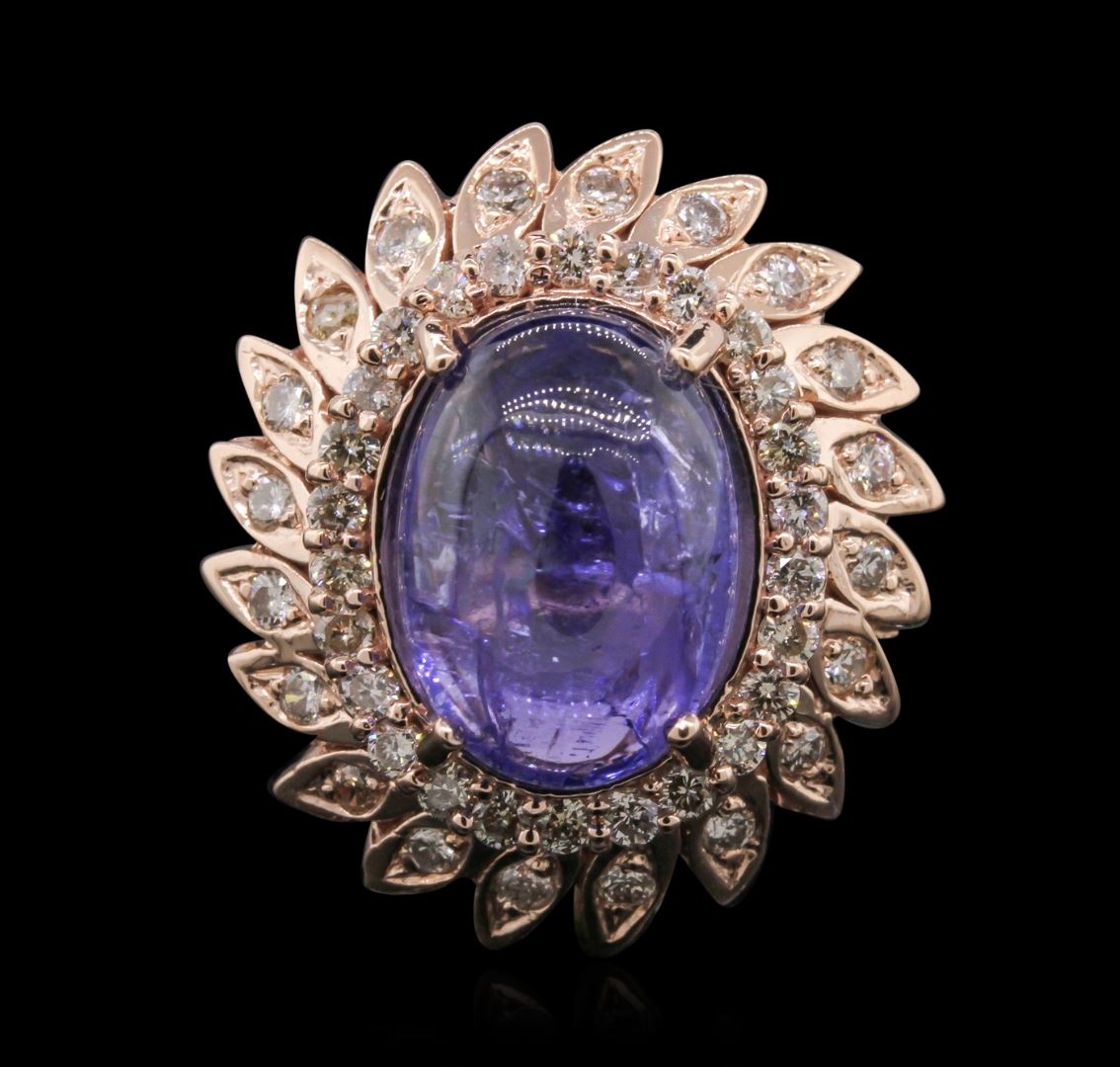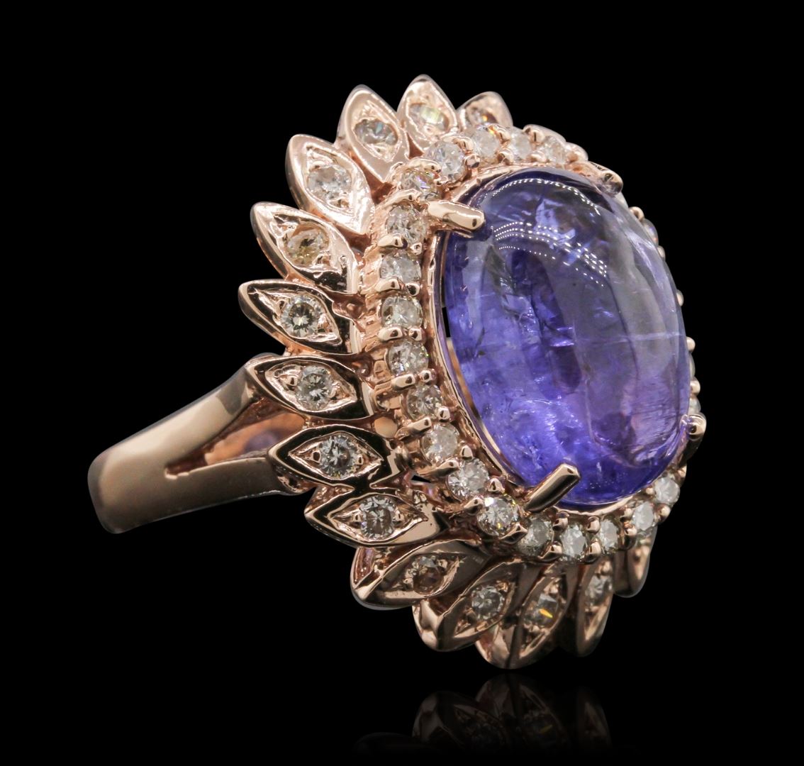 One electronically tested 14KT rose gold Ladies cast fancy ring with a bright polish finish. Condition is new. Identified with markings of "14K". Containing: One prong set oval cabochon cut natural tanzanite, measuring 14.00 x 10.00 x 6.50mm, approximate weight of 8.53ct., clarity is heavily included, medium light, very slightly grayish, violet color, (GIA V 4/3), cut is good. Colored gemstones are presumed to have been subjected to commonly used color/clarity enhancement processes. Forty-Six prong set round brilliant cut diamonds, measuring 1.80 - 1.80 x 1.08mm (depth est.) approximate. Total Weight of 46 Stones = 1.16ct. Clarity: SI-1 to SI-2. Color: K - L, Cut is Good. Total Weight of Colored Stones 8.53ct. Total Weight of Diamonds 1.16ct. Total Weight of Ring 12.50 grams. GGL Appraised at $12,770.00.
