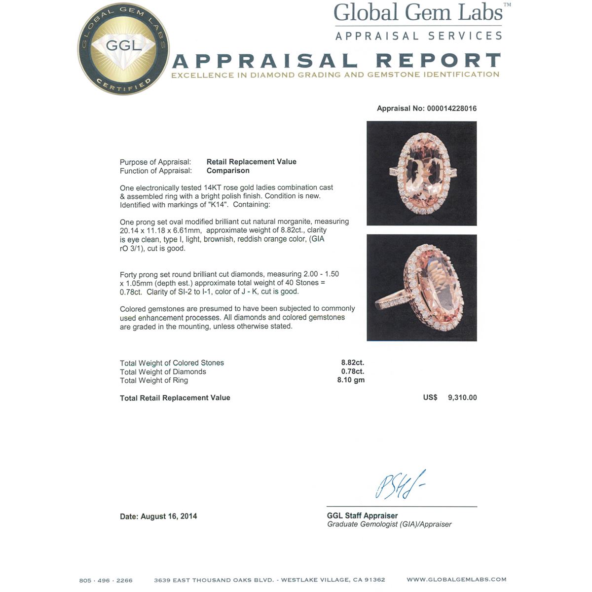 One electronically tested 14KT rose gold ladies combination cast & assembled ring with a bright polish finish. Condition is new. Identified with markings of "K14". Containing: One prong set oval modified brilliant cut natural morganite, measuring 20.14 x 11.18 x 6.61mm, approximate weight of 8.82ct., clarity is eye clean, type I, light, brownish, reddish orange color, (GIA rO 3/1), cut is good. Forty prong set round brilliant cut diamonds, measuring 2.00 - 1.50 x 1.05mm (depth est.) approximate. Total Weight of 40 Stones = 0.78ct. Clarity: SI-2 to I-1. Color: J - K, Cut is Good. Colored gemstones are presumed to have been subjected to commonly used enhancement processes. All diamonds and colored gemstones are graded in the mounting, unless otherwise stated. Total Weight of Colored Stones 8.82ct. Total Weight of Diamonds 0.78ct. Total Weight of Ring 8.10 grams. GGL Appraised at $9,310.00.