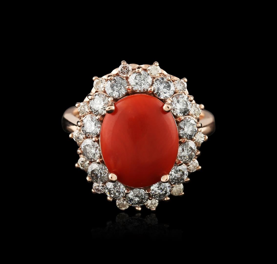 One electronically tested 14KT rose gold ladies cast coral and diamond ring with a bright polish finish. Identified with markings of "K14". Condition is new. Containing: Fourteen prong set round brilliant cut diamonds, measuring 2.90 - 2.90 x 1.74mm (depth est.) approximate total weight of 14 Stones = 1.25ct. Clarity: I-2 to I-3. Color: H - I, Cut is Good. Fourteen prong set round brilliant cut diamonds, measuring 1.70 - 1.50 x 0.96mm (depth est.) approximate total weight of 14 Stones = 0.21ct. Clarity: I-1 to I-2. Color: I - J, Cut is Good. Diamonds and colored gemstones are graded in the mounting, unless otherwise stated. Colored gemstones are presumed to have been subjected to commonly used enhancement processes. One prong set oval cabochon cut natural red coral, measuring 12.50 x 10.00 x 6.50mm, approximate weight of 8.88ct., clarity is heavily included, medium dark, brownish, red color, (GIA R 6/1), cut is good. Total Weight of Colored Stones 8.88ct. Total Weight of Diamonds 1.46ct. Total Weight of Ring 7.20 grams. GGL Appraised at $3,685.00.