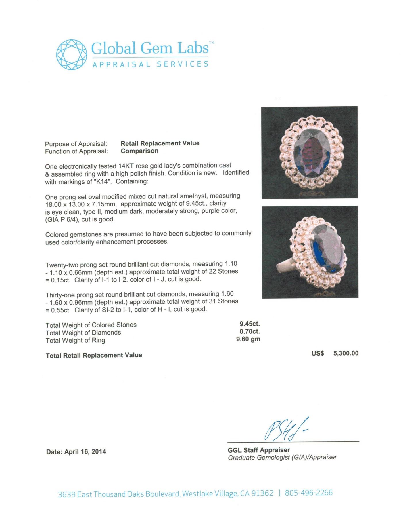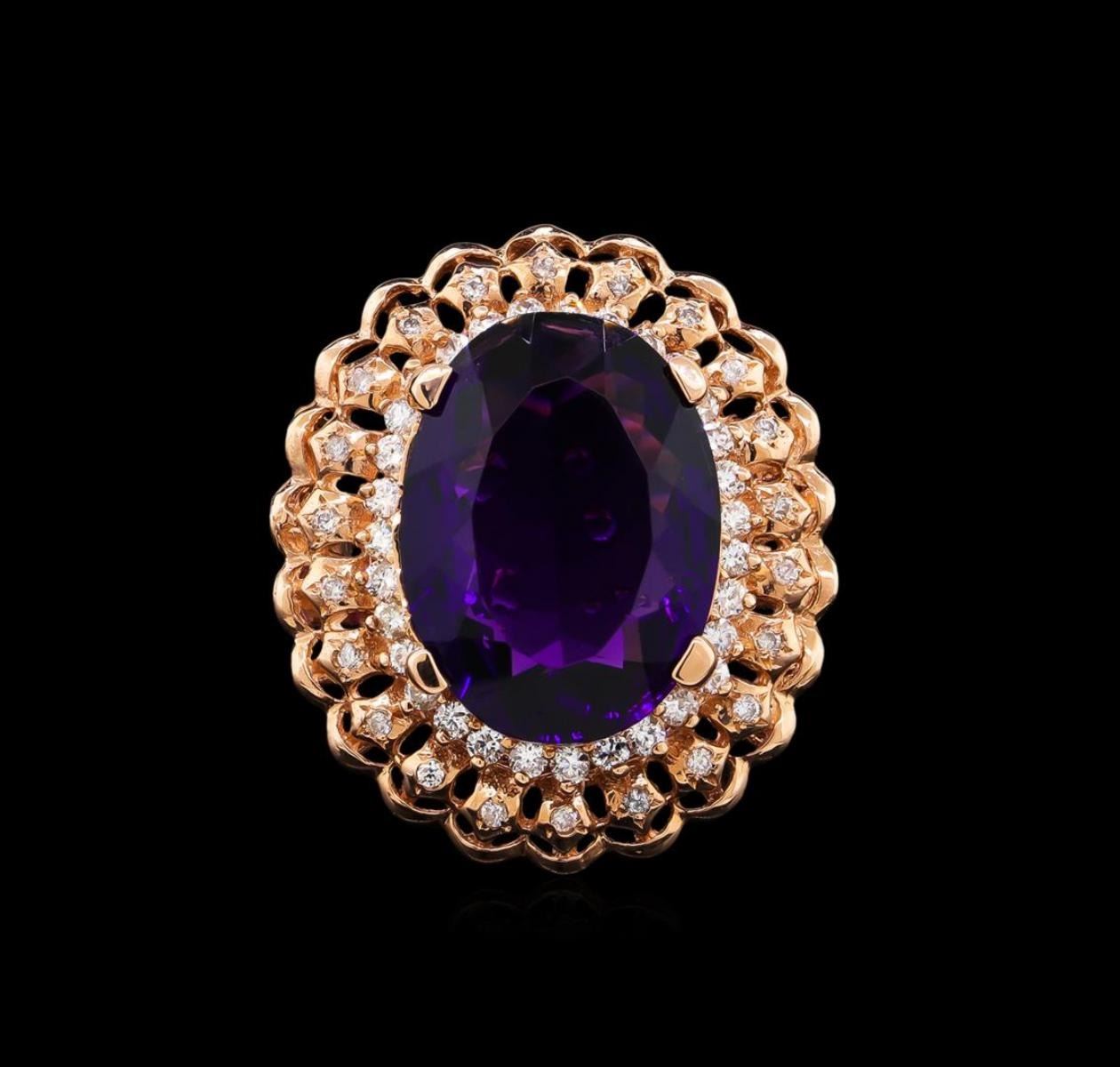 One electronically tested 14KT rose gold Ladies combination cast & assembled ring with a high polish finish. Condition is new. Identified with markings of "K14". Containing: One prong set oval modified mixed cut natural amethyst, measuring 18.00 x 13.00 x 7.15mm, approximate weight of 9.45ct., clarity is eye clean, type II, medium dark, moderately strong, purple color, (GIA P 6/4), cut is good. Colored gemstones are presumed to have been subjected to commonly used color/clarity enhancement processes. Twenty-Two prong set round brilliant cut diamonds, measuring 1.10 - 1.10 x 0.66mm (depth est.) approximate. Total Weight of 22 Stones = 0.15ct. Clarity: I-1 to I-2. Color: I - J, Cut is Good. Thirty-One prong set round brilliant cut diamonds, measuring 1.60 - 1.60 x 0.96mm (depth est.) approximate. Total Weight of 31 Stones = 0.55ct. Clarity: SI-2 to I-1. Color: H - I, Cut is Good. Total Weight of Colored Stones 9.45ct. Total Weight of Diamonds 0.70 ct. Total Weight of Ring 9.60 grams. GGL Appraised.