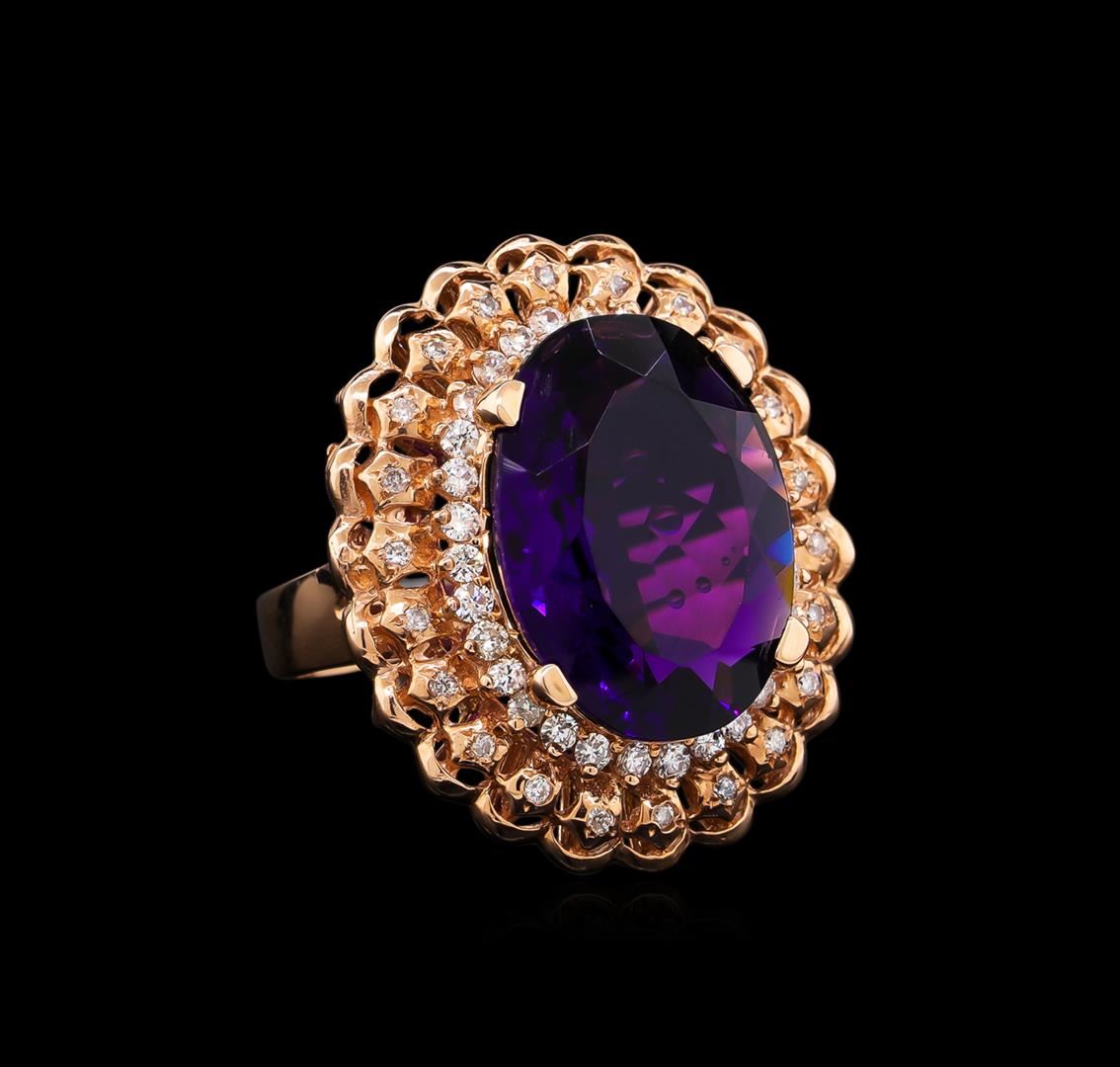 One electronically tested 14KT rose gold Ladies combination cast & assembled ring with a high polish finish. Condition is new. Identified with markings of "K14". Containing: One prong set oval modified mixed cut natural amethyst, measuring 18.00 x 13.00 x 7.15mm, approximate weight of 9.45ct., clarity is eye clean, type II, medium dark, moderately strong, purple color, (GIA P 6/4), cut is good. Colored gemstones are presumed to have been subjected to commonly used color/clarity enhancement processes. Twenty-Two prong set round brilliant cut diamonds, measuring 1.10 - 1.10 x 0.66mm (depth est.) approximate. Total Weight of 22 Stones = 0.15ct. Clarity: I-1 to I-2. Color: I - J, Cut is Good. Thirty-One prong set round brilliant cut diamonds, measuring 1.60 - 1.60 x 0.96mm (depth est.) approximate. Total Weight of 31 Stones = 0.55ct. Clarity: SI-2 to I-1. Color: H - I, Cut is Good. Total Weight of Colored Stones 9.45ct. Total Weight of Diamonds 0.70 ct. Total Weight of Ring 9.60 grams. GGL Appraised.
