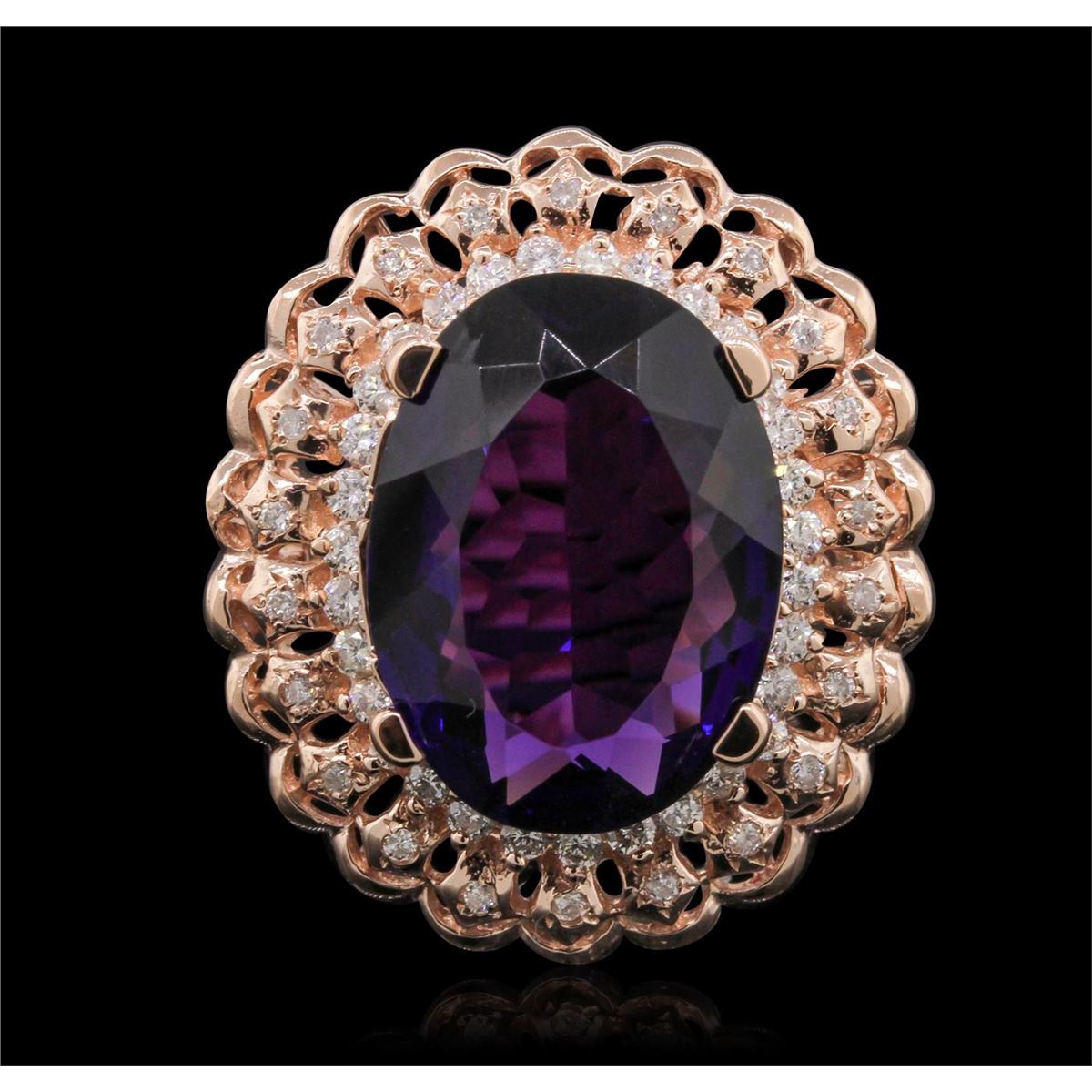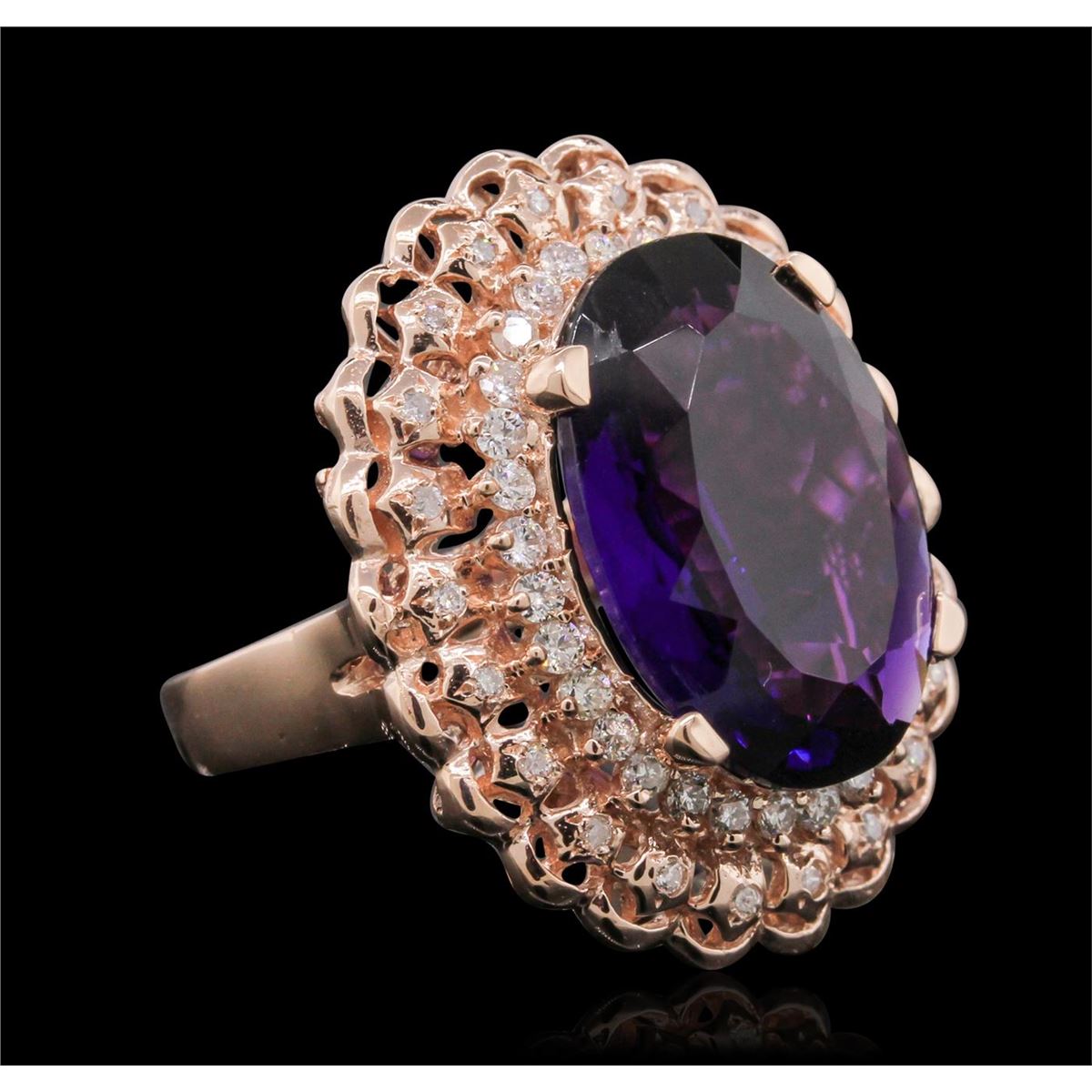 One electronically tested 14KT rose gold Ladies combination cast & assembled ring with a high polish finish. Condition is new. Identified with markings of "K14". Containing: One prong set oval modified mixed cut natural amethyst, measuring 18.00 x 13.00 x 7.15mm, approximate weight of 9.45ct., clarity is eye clean, type II, medium dark, moderately strong, purple color, (GIA P 6/4), cut is good. Colored gemstones are presumed to have been subjected to commonly used color/clarity enhancement processes. Twenty-Two prong set round brilliant cut diamonds, measuring 1.10 - 1.10 x 0.66mm (depth est.) approximate. Total Weight of 22 Stones = 0.15ct. Clarity: I-1 to I-2. Color: I - J, Cut is Good. Thirty-One prong set round brilliant cut diamonds, measuring 1.60 - 1.60 x 0.96mm (depth est.) approximate. Total Weight of 31 Stones = 0.55ct. Clarity: SI-2 to I-1. Color: H - I, Cut is Good. Total Weight of Colored Stones 9.45ct. Total Weight of Diamonds 0.70ct. Total Weight of Ring 9.60 grams. GGL Appraised at $5,300.00.