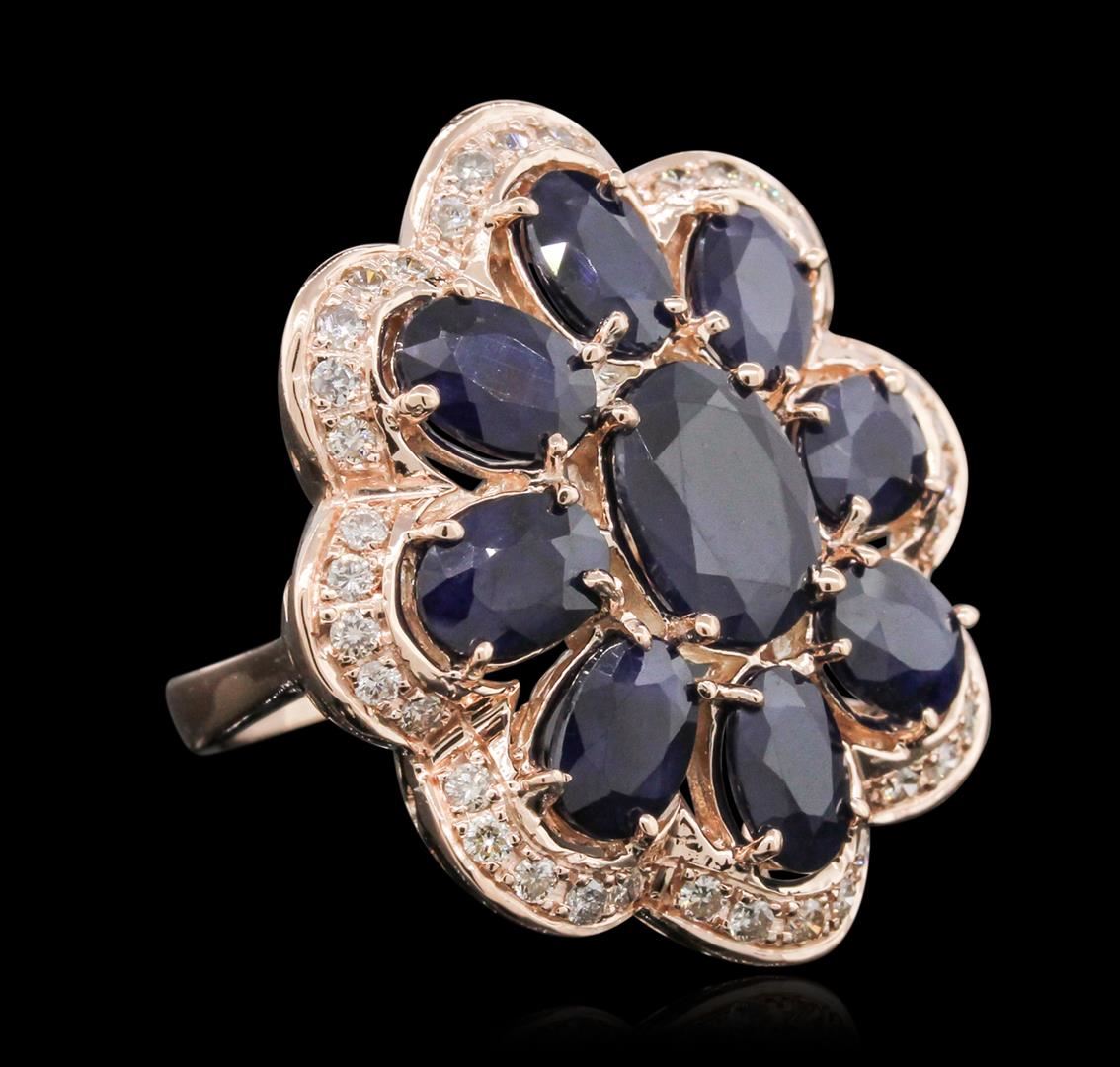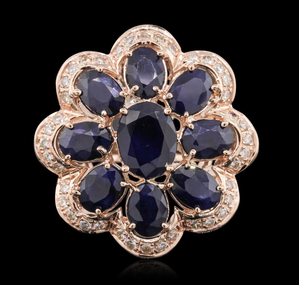 One electronically tested 14KT rose gold ladies cast sapphire and diamond ring with a bright polish finish. Condition is new, good workmanship. The ring features a sapphire floret set within a stylized diamond set bezel, completed by a three millimeter wide band. Identified with markings of "14K". Containing: One prong set oval mixed cut natural blue sapphire, measuring 10.00 x 7.50 x 4.40mm, 5%. bulge factor, approximate weight of 2.93ct., clarity is severely included, type II, dark, very slightly grayish, violetish blue color, (GIA vB 7/3), cut is good. Transmitting light very diffusely, opaque. Naturally occurring internal & external characteristics are present. Indications of multiple laboratory enhancements, including high temperature heat treatment and diffusion treatment. Graded in the setting. Eight prong set oval mixed cut natural blue sapphires, measuring 7.00 x 5.00 x 3.00mm, approximate. Total Weight of 6.98ct., clarity is heavily included, type II, medium dark, very slightly grayish, violetish blue color, (GIA vB 6/3), cut is good. Transmitting light diffusely translucent. Naturally occurring internal & external characteristics are present, including partial color zoning. Measurements & the color grade are an average for the group. Indications of multiple laboratory enhancements, including high temperature heat treatment and diffusion treatment. Graded in the setting. Forty bead set round brilliant cut diamonds, measuring 1.70 - 1.60 x 0.99mm (depth est.) approximate. Total Weight of 40 Stones = 0.75ct. Graded in the setting. Clarity: VS-2 to SI-2. Color: H - J. Total Weight of Colored Stones 9.91ct. Total Weight of Diamonds 0.75ct. Total Weight of Ring 15.95 grams. AIG Appraised at $7,165.00.