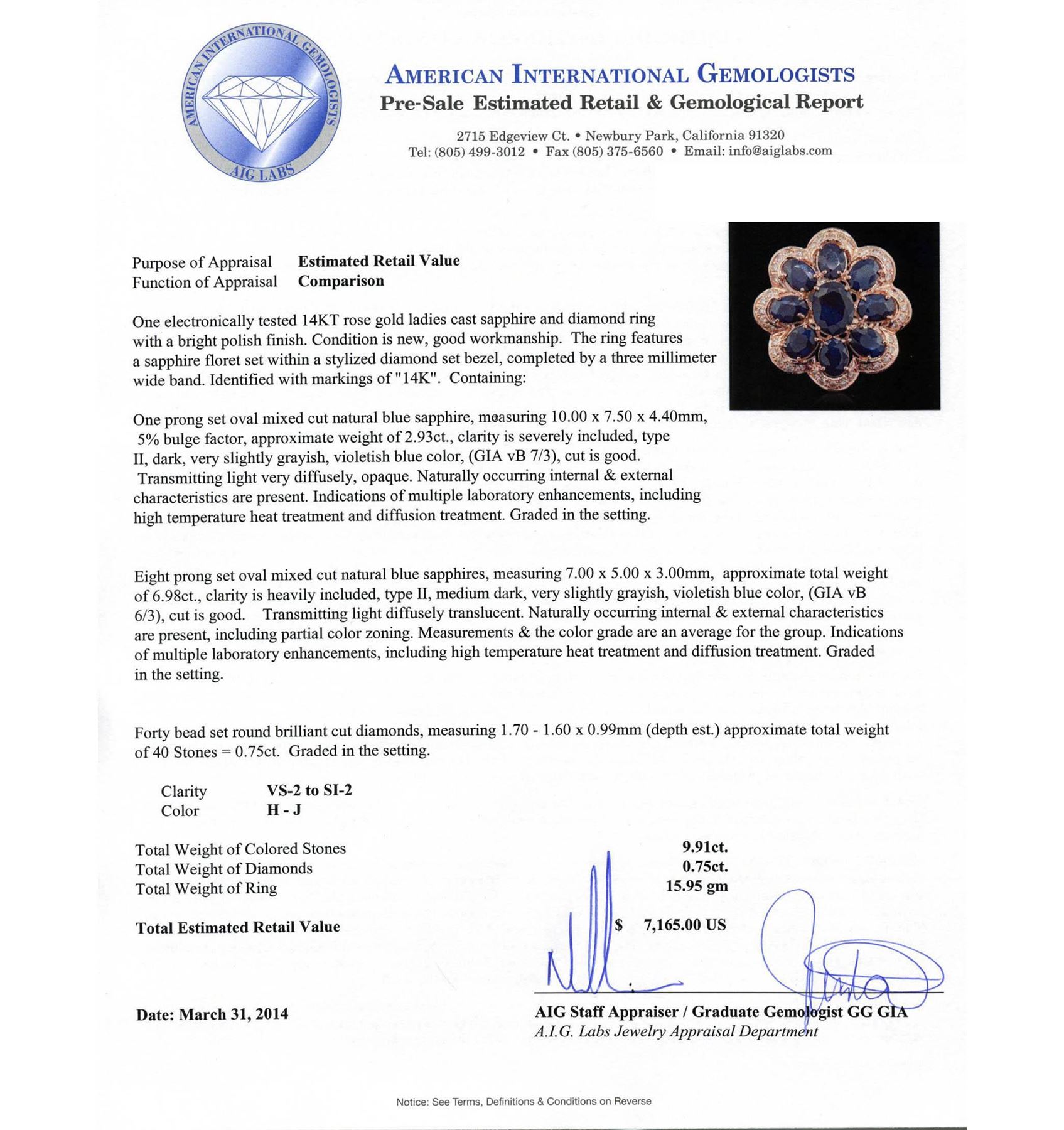 One electronically tested 14KT rose gold ladies cast sapphire and diamond ring with a bright polish finish. Condition is new, good workmanship. The ring features a sapphire floret set within a stylized diamond set bezel, completed by a three millimeter wide band. Identified with markings of "14K". Containing: One prong set oval mixed cut natural blue sapphire, measuring 10.00 x 7.50 x 4.40mm, 5%. bulge factor, approximate weight of 2.93ct., clarity is severely included, type II, dark, very slightly grayish, violetish blue color, (GIA vB 7/3), cut is good. Transmitting light very diffusely, opaque. Naturally occurring internal & external characteristics are present. Indications of multiple laboratory enhancements, including high temperature heat treatment and diffusion treatment. Graded in the setting. Eight prong set oval mixed cut natural blue sapphires, measuring 7.00 x 5.00 x 3.00mm, approximate. Total Weight of 6.98ct., clarity is heavily included, type II, medium dark, very slightly grayish, violetish blue color, (GIA vB 6/3), cut is good. Transmitting light diffusely translucent. Naturally occurring internal & external characteristics are present, including partial color zoning. Measurements & the color grade are an average for the group. Indications of multiple laboratory enhancements, including high temperature heat treatment and diffusion treatment. Graded in the setting. Forty bead set round brilliant cut diamonds, measuring 1.70 - 1.60 x 0.99mm (depth est.) approximate. Total Weight of 40 Stones = 0.75ct. Graded in the setting. Clarity: VS-2 to SI-2. Color: H - J. Total Weight of Colored Stones 9.91ct. Total Weight of Diamonds 0.75ct. Total Weight of Ring 15.95 grams. AIG Appraised at $7,165.00.