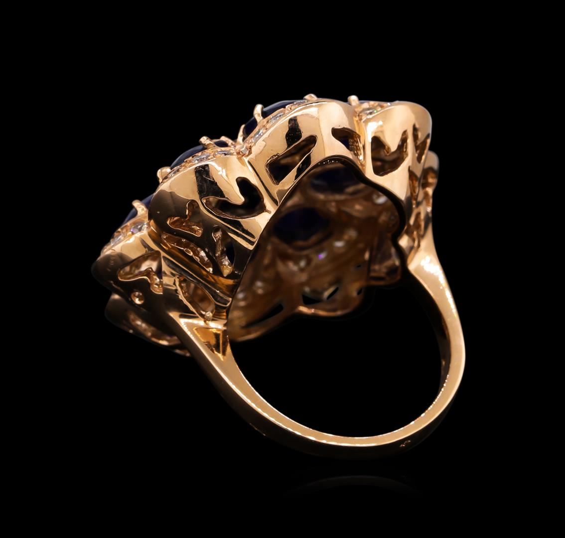 One electronically tested 14KT rose gold ladies cast sapphire and diamond ring with a bright polish finish. Condition is new, good workmanship. The ring features a sapphire floret set within a stylized diamond set bezel, completed by a three millimeter wide band. Identified with markings of "14K". Containing: One prong set oval mixed cut natural blue sapphire, measuring 10.00 x 7.50 x 4.40mm, 5%. bulge factor, approximate weight of 2.93ct., clarity is severely included, type II, dark, very slightly grayish, violetish blue color, (GIA vB 7/3), cut is good. Transmitting light very diffusely, opaque. Naturally occurring internal & external characteristics are present. Indications of multiple laboratory enhancements, including high temperature heat treatment and diffusion treatment. Graded in the setting. Eight prong set oval mixed cut natural blue sapphires, measuring 7.00 x 5.00 x 3.00mm, approximate. Total Weight of 6.98ct., clarity is heavily included, type II, medium dark, very slightly grayish, violetish blue color, (GIA vB 6/3), cut is good. Transmitting light diffusely translucent. Naturally occurring internal & external characteristics are present, including partial color zoning. Measurements & the color grade are an average for the group. Indications of multiple laboratory enhancements, including high temperature heat treatment and diffusion treatment. Graded in the setting. Forty bead set round brilliant cut diamonds, measuring 1.70 - 1.60 x 0.99mm (depth est.) approximate. Total Weight of 40 Stones = 0.75ct. Graded in the setting. Clarity: VS-2 to SI-2. Color: H - J. Total Weight of Colored Stones 9.91ct. Total Weight of Diamonds 0.75ct. Total Weight of Ring 15.95 grams. AIG Appraised at $7,165.00.