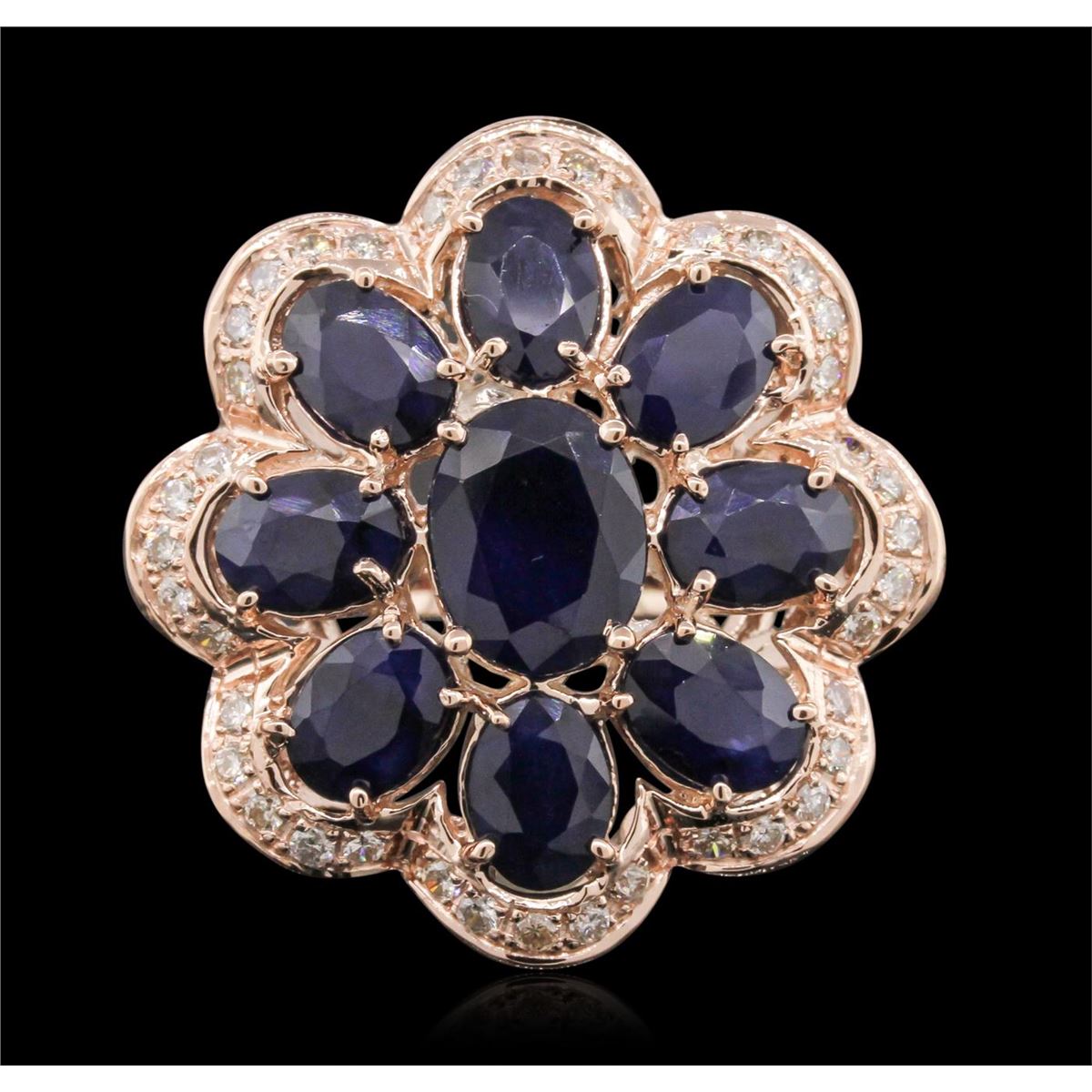 One electronically tested 14KT rose gold ladies cast sapphire and diamond ring with a bright polish finish. Condition is new, good workmanship. The ring features a sapphire floret set within a stylized diamond set bezel, completed by a three millimeter wide band. Identified with markings of "14K". Containing: One prong set oval mixed cut natural blue sapphire, measuring 10.00 x 7.50 x 4.40mm, 5%. bulge factor, approximate weight of 2.93ct., clarity is severely included, type II, dark, very slightly grayish, violetish blue color, (GIA vB 7/3), cut is good. Transmitting light very diffusely, opaque. Naturally occurring internal & external characteristics are present. Indications of multiple laboratory enhancements, including high temperature heat treatment and diffusion treatment. Graded in the setting. Eight prong set oval mixed cut natural blue sapphires, measuring 7.00 x 5.00 x 3.00mm, approximate. Total Weight of 6.98ct., clarity is heavily included, type II, medium dark, very slightly grayish, violetish blue color, (GIA vB 6/3), cut is good. Transmitting light diffusely translucent. Naturally occurring internal & external characteristics are present, including partial color zoning. Measurements & the color grade are an average for the group. Indications of multiple laboratory enhancements, including high temperature heat treatment and diffusion treatment. Graded in the setting. Forty bead set round brilliant cut diamonds, measuring 1.70 - 1.60 x 0.99mm (depth est.) approximate. Total Weight of 40 Stones = 0.75ct. Graded in the setting. Clarity: VS-2 to SI-2. Color: H - J. Total Weight of Colored Stones 9.91ct. Total Weight of Diamonds 0.75ct. Total Weight of Ring 15.95 grams. AIG Appraised at $7,165.00.