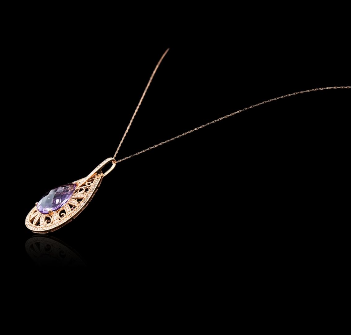 One electronically tested 14KT rose gold ladies combination cast & assembled amethyst and diamond pendant & chain 18.0" long, cable link with a spring ring clasp with a bright polish finish. Identified with markings of "14K". Condition is new. Containing: One prong set pear modified mixed cut natural amethyst, measuring 17.58 x 12.82 x 8.33mm, approximate weight of 9.99ct., clarity is eye clean, type II, light, very slightly grayish, purple color, (GIA P 3/3), cut is good. One Hundred Twenty-Three prong set round brilliant cut diamonds, measuring 1.30 - 1.00. x 0.69mm (depth est.) approximate total weight of 123 Stones = 0.68ct. Clarity: SI-1 to SI. Color: M - N, Cut is Good. Colored gemstones are presumed to have been subjected to commonly used enhancement processes. All diamonds and colored gemstones are graded in the mounting, unless otherwise stated. Total Weight of Colored Stones 9.99ct. Total Weight of Diamonds 0.68ct. Total Weight of Pendant & Chain 8.70 grams. GGL Appraised at $3,345.00.