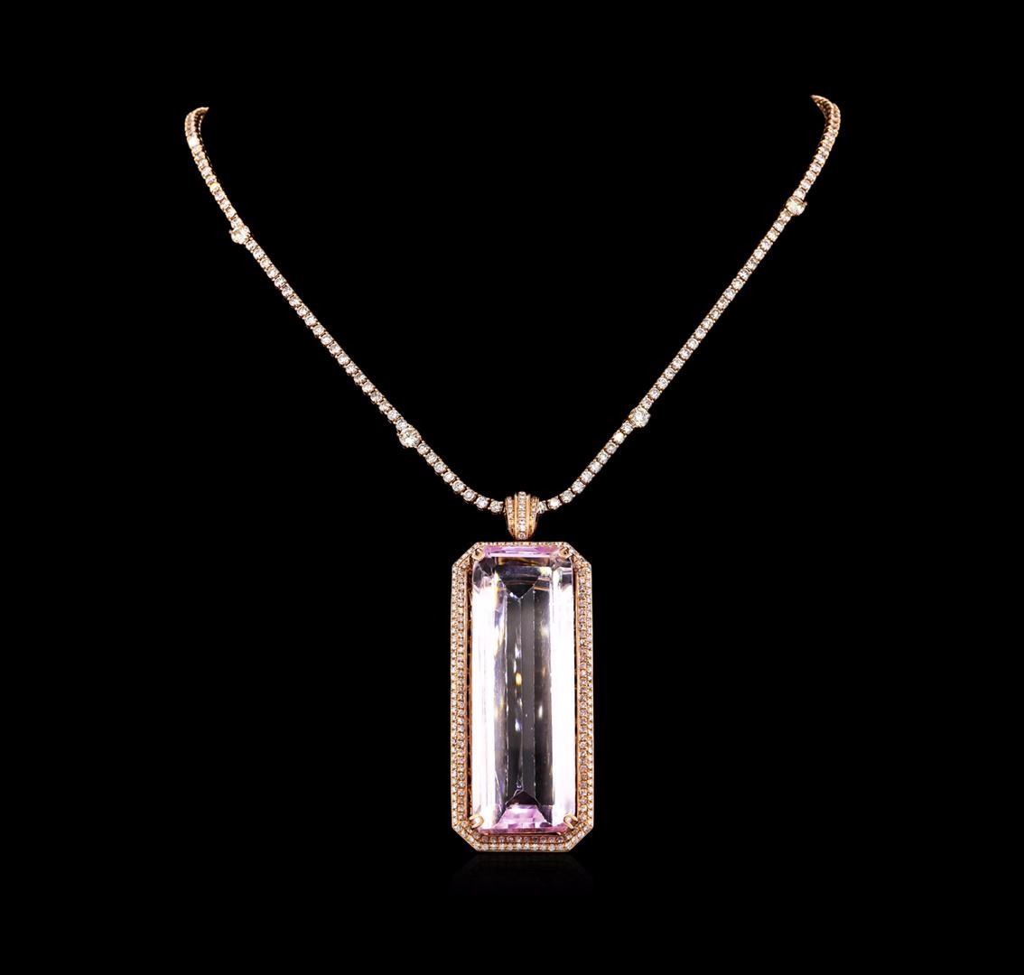 One electronically tested 14KT rose gold ladies cast & assembled kunzite and diamond pendant/enhancer with chain. Condition is new, good workmanship. The pendant/enhancer features a kunzite set within a tiered diamond bezel, completed by a diamond set snap-locking clasp. The pendant/enhancer is supported by a seventeen and one-quarter inch length 14KT rose gold diamond set chain, terminating in a concealed clasp with safety. Bright polish finish with milgrain detailing. Identified with markings of "585". Containing: One prong set octagonal step cut natural kunzite, measuring 55.81 x 19.36 x 13.08mm, exact weight 162.70ct., type I Clarity is eye clean, light, very slightly grayish, purplish-pink color, (GIA pPi 3/3), cut is good. Transmitting light with no distortion, transparent. GIA Gemological Report attached. Graded loose prior to setting in the GIA Laboratory, Report #1166000102.Three Hundred Seventy-Four prong set round brilliant cut diamonds (depth est.) approximate. Total Weight of 374 Stones = 11.93ct. Graded in the setting. Clarity: SI-1 to I-1. Color: G - J. Total Weight of Colored Stones162.70ct. Total Weight of Diamonds 11.93ct. Total Weight of Pendant/Enhancer With Chain 74.22 grams. AIG Appraised at $72,765.00.