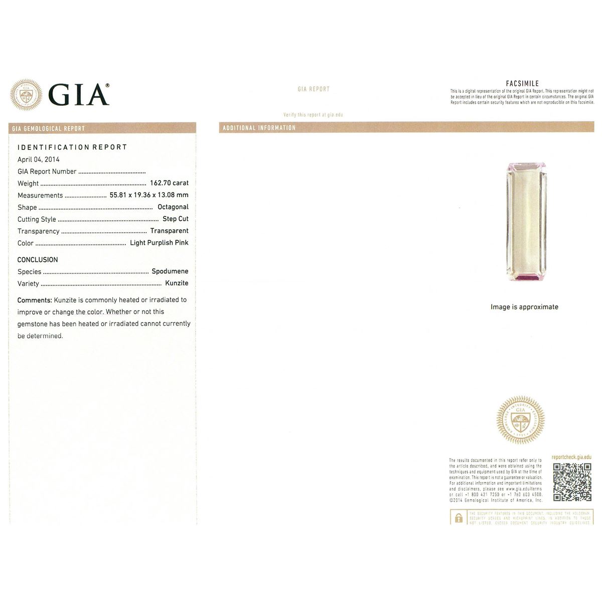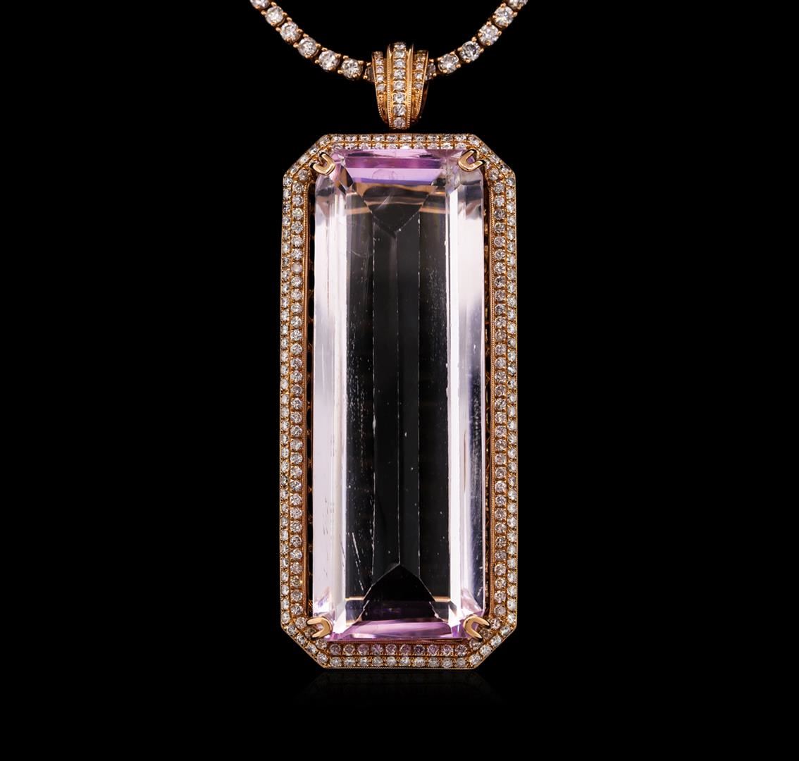 One electronically tested 14KT rose gold ladies cast & assembled kunzite and diamond pendant/enhancer with chain. Condition is new, good workmanship. The pendant/enhancer features a kunzite set within a tiered diamond bezel, completed by a diamond set snap-locking clasp. The pendant/enhancer is supported by a seventeen and one-quarter inch length 14KT rose gold diamond set chain, terminating in a concealed clasp with safety. Bright polish finish with milgrain detailing. Identified with markings of "585". Containing: One prong set octagonal step cut natural kunzite, measuring 55.81 x 19.36 x 13.08mm, exact weight 162.70ct., type I Clarity is eye clean, light, very slightly grayish, purplish-pink color, (GIA pPi 3/3), cut is good. Transmitting light with no distortion, transparent. GIA Gemological Report attached. Graded loose prior to setting in the GIA Laboratory, Report #1166000102.Three Hundred Seventy-Four prong set round brilliant cut diamonds (depth est.) approximate. Total Weight of 374 Stones = 11.93ct. Graded in the setting. Clarity: SI-1 to I-1. Color: G - J. Total Weight of Colored Stones162.70ct. Total Weight of Diamonds 11.93ct. Total Weight of Pendant/Enhancer With Chain 74.22 grams. AIG Appraised at $72,765.00.