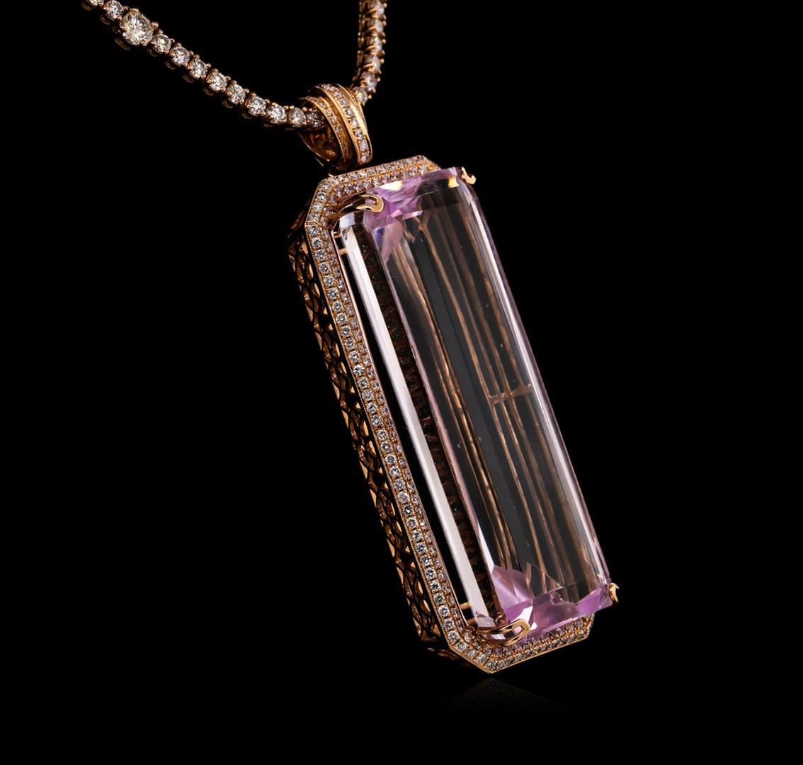 One electronically tested 14KT rose gold ladies cast & assembled kunzite and diamond pendant/enhancer with chain. Condition is new, good workmanship. The pendant/enhancer features a kunzite set within a tiered diamond bezel, completed by a diamond set snap-locking clasp. The pendant/enhancer is supported by a seventeen and one-quarter inch length 14KT rose gold diamond set chain, terminating in a concealed clasp with safety. Bright polish finish with milgrain detailing. Identified with markings of "585". Containing: One prong set octagonal step cut natural kunzite, measuring 55.81 x 19.36 x 13.08mm, exact weight 162.70 ct., type I Clarity is eye clean, light, very slightly grayish, purplish-pink color, (GIA pPi 3/3), cut is good. Transmitting light with no distortion, transparent. GIA Gemological Report attached. Graded loose prior to setting in the GIA Laboratory, Report #1166000102.Three Hundred Seventy-Four prong set round brilliant cut diamonds (depth est.) approximate. Total Weight of 374 Stones = 11.93ct. Graded in the setting. Clarity: SI-1 to I-1. Color: G - J. Total Weight of Colored Stones162.70 ct. Total Weight of Diamonds 11.93ct. Total Weight of Pendant/Enhancer With Chain 74.22 grams. AIG Appraised.