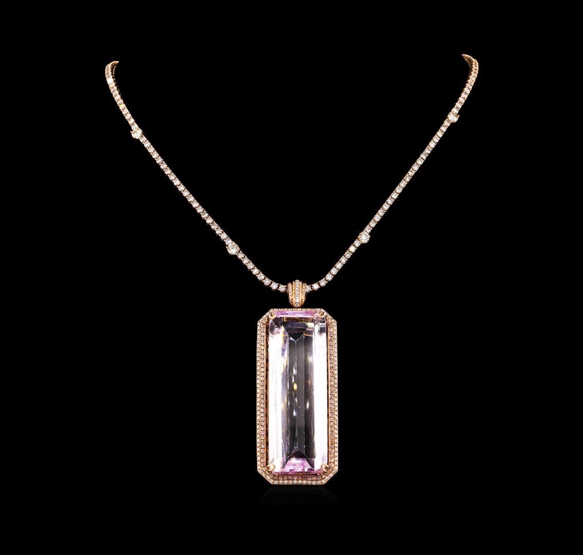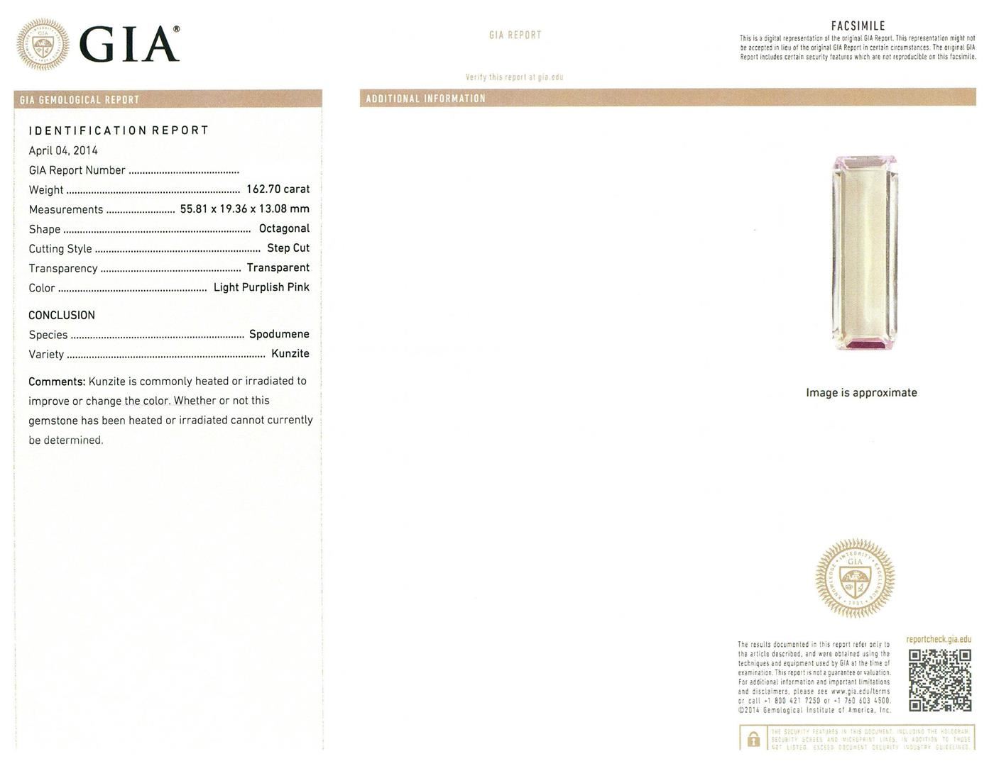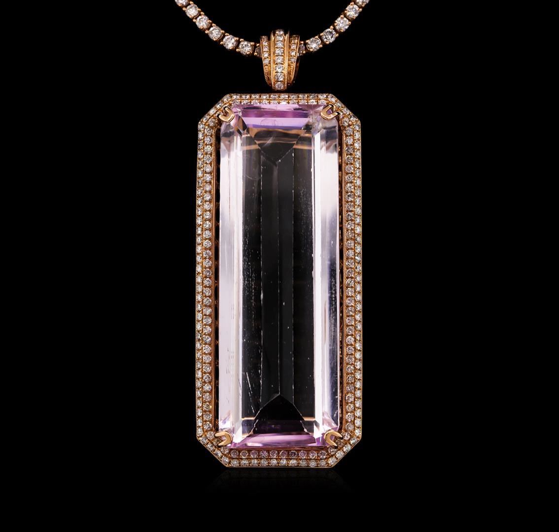 One electronically tested 14KT rose gold ladies cast & assembled kunzite and diamond pendant/enhancer with chain. Condition is new, good workmanship. The pendant/enhancer features a kunzite set within a tiered diamond bezel, completed by a diamond set snap-locking clasp. The pendant/enhancer is supported by a seventeen and one-quarter inch length 14KT rose gold diamond set chain, terminating in a concealed clasp with safety. Bright polish finish with milgrain detailing. Identified with markings of "585". Containing: One prong set octagonal step cut natural kunzite, measuring 55.81 x 19.36 x 13.08mm, exact weight 162.70 ct., type I Clarity is eye clean, light, very slightly grayish, purplish-pink color, (GIA pPi 3/3), cut is good. Transmitting light with no distortion, transparent. GIA Gemological Report attached. Graded loose prior to setting in the GIA Laboratory, Report #1166000102.Three Hundred Seventy-Four prong set round brilliant cut diamonds (depth est.) approximate. Total Weight of 374 Stones = 11.93ct. Graded in the setting. Clarity: SI-1 to I-1. Color: G - J. Total Weight of Colored Stones162.70 ct. Total Weight of Diamonds 11.93ct. Total Weight of Pendant/Enhancer With Chain 74.22 grams. AIG Appraised.