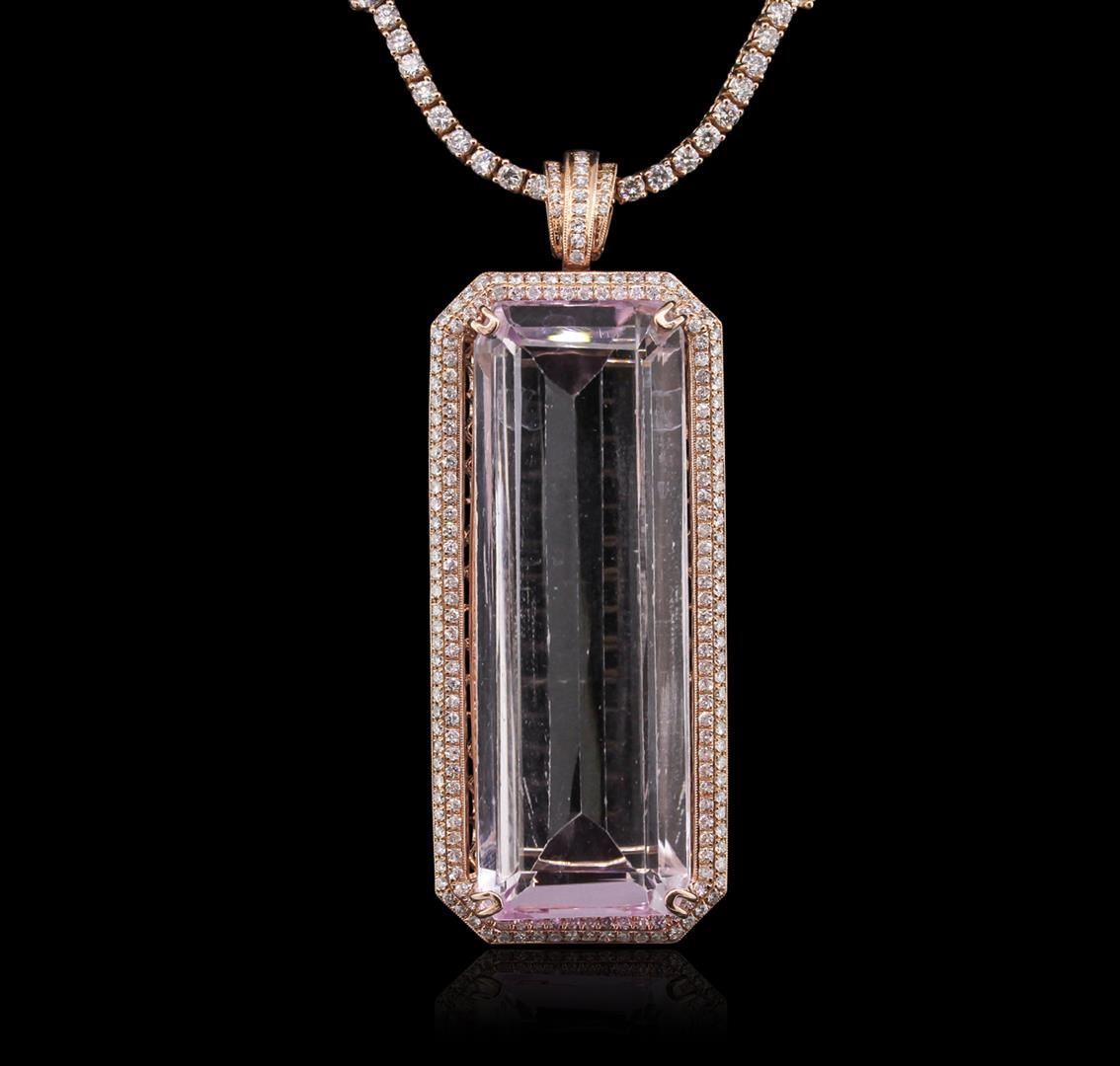 One electronically tested 14KT rose gold ladies cast & assembled kunzite and diamond pendant/enhancer with chain. Condition is new, good workmanship. The pendant/enhancer features a kunzite set within a tiered diamond bezel, completed by a diamond set snap-locking clasp. The pendant/enhancer is supported by a seventeen and one-quarter inch length 14KT rose gold diamond set chain, terminating in a concealed clasp with safety. Bright polish finish with milgrain detailing. Identified with markings of "585". Containing: One prong set octagonal step cut natural kunzite, measuring 55.81 x 19.36 x 13.08mm, exact weight 162.70ct., type I Clarity is eye clean, light, very slightly grayish, purplish-pink color, (GIA pPi 3/3), cut is good. Transmitting light with no distortion, transparent. GIA Gemological Report attached. Graded loose prior to setting in the GIA Laboratory, Report #1166000102.Three Hundred Seventy-Four prong set round brilliant cut diamonds (depth est.) approximate. Total Weight of 374 Stones = 11.93ct. Graded in the setting. Clarity: SI-1 to I-1. Color: G - J. Total Weight of Colored Stones162.70ct. Total Weight of Diamonds 11.93ct. Total Weight of Pendant/Enhancer With Chain 74.22 grams. AIG Appraised at $72,765.00.
