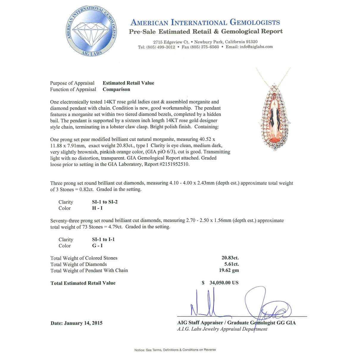 One electronically tested 14KT rose gold ladies cast & assembled morganite and diamond pendant with chain. The pendant features a morganite set within two tiered diamond bezels, completed by a hidden bail. The pendant is supported by a sixteen inch length 14KT rose gold designer style chain, terminating in a lobster claw clasp. Bright polish finish. Condition is new, good workmanship. Containing: One prong set pear modified brilliant cut natural morganite, measuring 40.52 x 11.88 x 7.91mm, exact weight 20.83ct., type I Clarity is eye clean, medium dark, very slightly brownish, pinkish orange color, (GIA piO 6/3), cut is good. Transmitting light with no distortion, transparent. GIA Gemological Report attached. Graded loose prior to setting in the GIA Laboratory, Report #2151952510.Three prong set round brilliant cut diamonds, measuring 4.10 - 4.00 x 2.43mm (depth est.) approximate total weight of 3 Stones = 0.82ct. Graded in the setting. Clarity: SI-1 to SI-2. Color: H - I Seventy-Three prong set round brilliant cut diamonds, measuring 2.70 - 2.50 x 1.56mm (depth est.) approximate total weight of 73 Stones = 4.79ct. Graded in the setting. Clarity: SI-1 to I-1. Color: G - I. Total Weight of Colored Stones 20.83ct. Total Weight of Diamonds 5.61ct. Total Weight of Pendant With Chain 19.62 grams. AIG Appraised at $34,050.00.