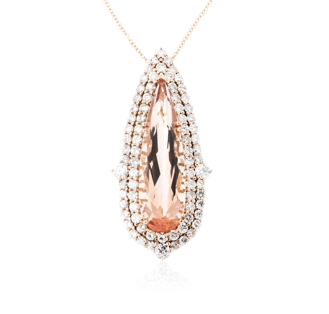 One electronically tested 14KT rose gold ladies cast & assembled morganite and diamond pendant with chain. The pendant features a morganite set within two tiered diamond bezels, completed by a hidden bail. The pendant is supported by a sixteen inch length 14KT rose gold designer style chain, terminating in a lobster claw clasp. Bright polish finish. Condition is new, good workmanship. Containing: One prong set pear modified brilliant cut natural morganite, measuring 40.52 x 11.88 x 7.91mm, exact weight 20.83ct., type I Clarity is eye clean, medium dark, very slightly brownish, pinkish orange color, (GIA piO 6/3), cut is good. Transmitting light with no distortion, transparent. GIA Gemological Report attached. Graded loose prior to setting in the GIA Laboratory, Report #2151952510.Three prong set round brilliant cut diamonds, measuring 4.10 - 4.00 x 2.43mm (depth est.) approximate total weight of 3 Stones = 0.82ct. Graded in the setting. Clarity: SI-1 to SI-2. Color: H - I Seventy-Three prong set round brilliant cut diamonds, measuring 2.70 - 2.50 x 1.56mm (depth est.) approximate total weight of 73 Stones = 4.79ct. Graded in the setting. Clarity: SI-1 to I-1. Color: G - I. Total Weight of Colored Stones 20.83ct. Total Weight of Diamonds 5.61ct. Total Weight of Pendant With Chain 19.62 grams. AIG Appraised at $34,050.00.