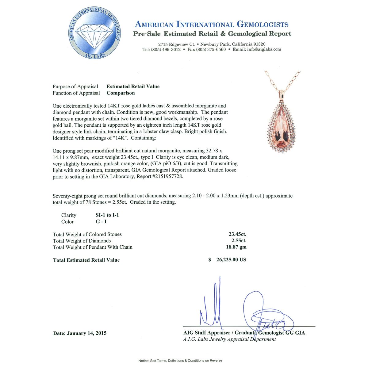 One electronically tested 14KT rose gold ladies cast & assembled morganite and diamond pendant with chain. The pendant features a morganite set within two tiered diamond bezels, completed by a rose gold bail. The pendant is supported by an eighteen inch length 14KT rose gold designer style link chain, terminating in a lobster claw clasp. Bright polish finish. Identified with markings of "14K". Condition is new, good workmanship. Containing: One prong set pear modified brilliant cut natural morganite, measuring 32.78 x 14.11 x 9.87mm, exact weight 23.45ct., type I Clarity is eye clean, medium dark, very slightly brownish, pinkish orange color, (GIA piO 6/3), cut is good. Transmitting light with no distortion, transparent. GIA Gemological Report attached. Graded loose prior to setting in the GIA Laboratory, Report #2151957728.Seventy-Eight prong set round brilliant cut diamonds, measuring 2.10 - 2.00 x 1.23mm (depth est.) approximate total weight of 78 Stones = 2.55ct. Graded in the setting. Clarity: SI-1 to I-1. Color: G - I. Total Weight of Colored Stones 23.45ct. Total Weight of Diamonds 2.55ct. Total Weight of Pendant With Chain 18.87 grams. AIG Appraised at $26,225.00.
