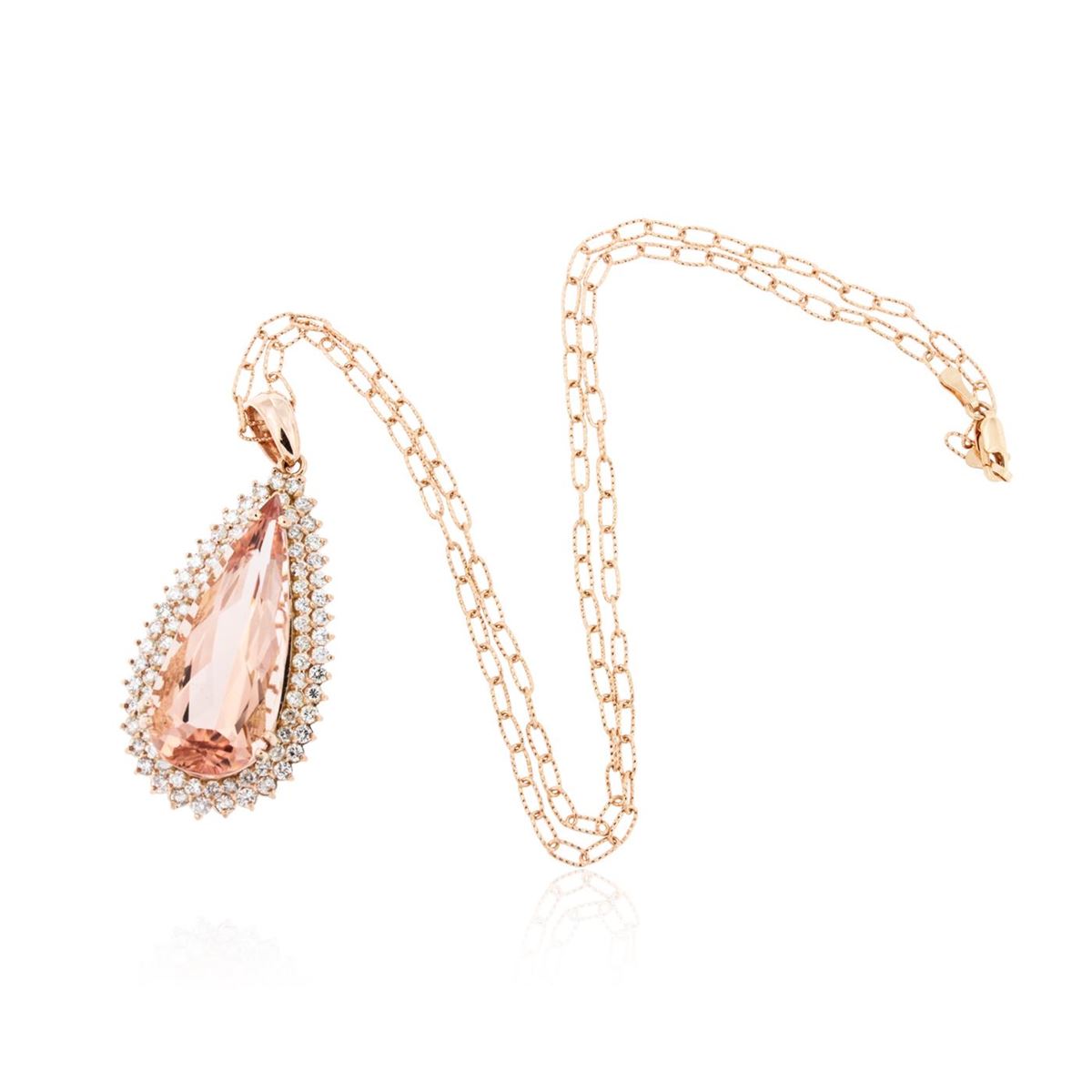 One electronically tested 14KT rose gold ladies cast & assembled morganite and diamond pendant with chain. The pendant features a morganite set within two tiered diamond bezels, completed by a rose gold bail. The pendant is supported by an eighteen inch length 14KT rose gold designer style link chain, terminating in a lobster claw clasp. Bright polish finish. Identified with markings of "14K". Condition is new, good workmanship. Containing: One prong set pear modified brilliant cut natural morganite, measuring 32.78 x 14.11 x 9.87mm, exact weight 23.45ct., type I Clarity is eye clean, medium dark, very slightly brownish, pinkish orange color, (GIA piO 6/3), cut is good. Transmitting light with no distortion, transparent. GIA Gemological Report attached. Graded loose prior to setting in the GIA Laboratory, Report #2151957728.Seventy-Eight prong set round brilliant cut diamonds, measuring 2.10 - 2.00 x 1.23mm (depth est.) approximate total weight of 78 Stones = 2.55ct. Graded in the setting. Clarity: SI-1 to I-1. Color: G - I. Total Weight of Colored Stones 23.45ct. Total Weight of Diamonds 2.55ct. Total Weight of Pendant With Chain 18.87 grams. AIG Appraised at $26,225.00.