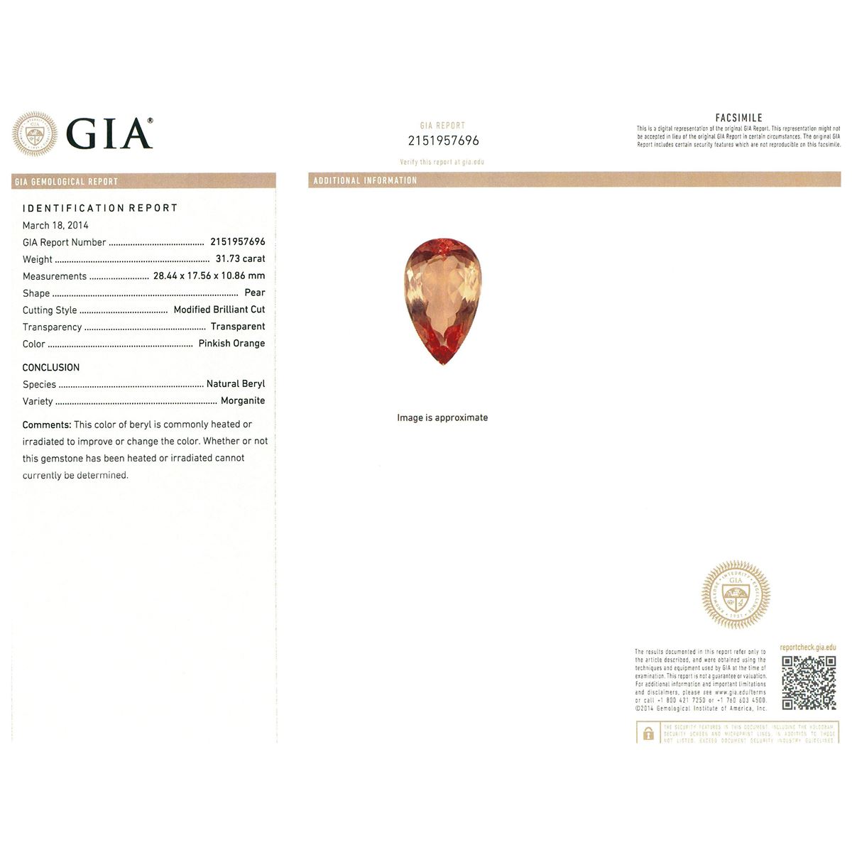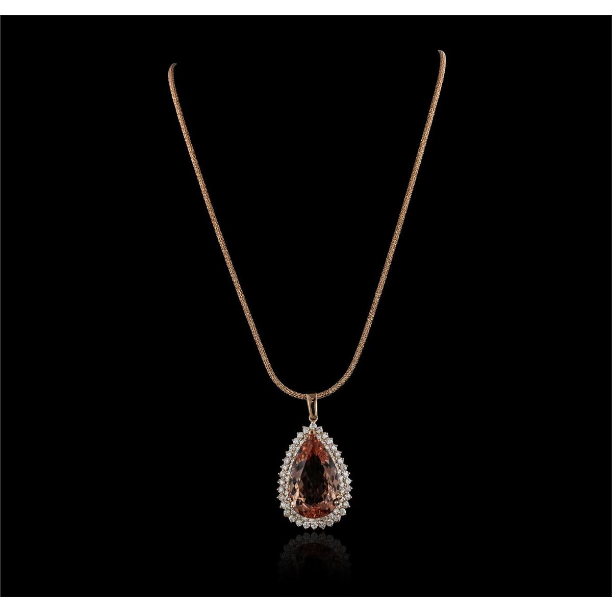 One electronically tested 14KT rose gold ladies cast & assembled morganite and diamond pendant with chain. Condition is new, good workmanship. The pendant features a morganite set within a two tiered diamond bezel, completed by a rose gold bail. The pendant is supported by an eighteen inch length 14KT rose gold woven chain, terminating in a lobster claw clasp. Bright polish finish. Identified with markings of "14K". Containing: One prong set pear modified brilliant cut natural morganite, measuring 28.44 x 17.56 x 10.86mm, exact weight 31.73ct., type I Clarity is eye clean, medium, very slightly brownish, pinkish orange color, (GIA piO 5/3), cut is good. Transmitting light with no distortion, transparent. GIA Gemological Report attached. Graded loose prior to setting in the GIA Laboratory, Report #2151957696.Sixty-Eight prong set round brilliant cut diamonds, measuring 2.30 - 2.10 x 1.32mm (depth est.) approximate. Total Weight of 68 Stones = 2.74ct. Graded in the setting. Clarity: SI-1 to I-1. Color: G - I. Total Weight of Colored Stones 31.73ct. Total Weight of Diamonds 2.74ct. Total Weight of Pendant With Chain 27.02 grams. AIG Appraised at $33,505.00.