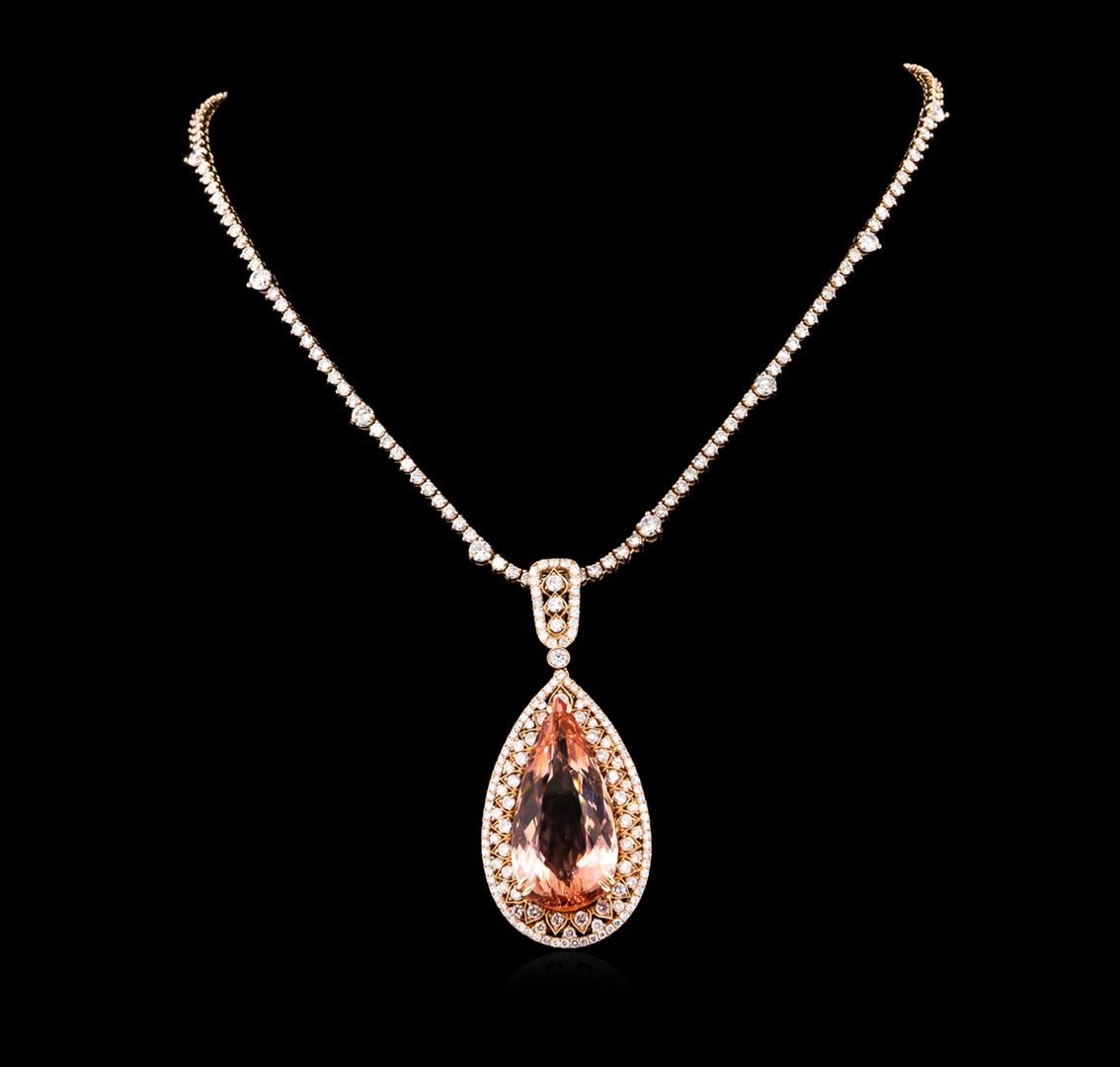 One electronically tested 14KT rose gold ladies cast & assembled morganite and diamond pendant/enhancer with chain. Condition is new, good workmanship. The pendant/enhancer features a morganite set within a tiered diamond bezel, completed by a diamond set snap-locking clasp. The pendant/enhancer is supported by a seventeen and one-quarter inch length 14KT rose gold diamond set chain, terminating in a concealed clasp with safety. Bright polish finish with milgrain detailing. Identified with markings of "585 14K". Containing: One prong set pear modified brilliant cut natural morganite, measuring 36.71 x 18.04 x 11.05mm, exact weight 42.02ct., type I Clarity is eye clean, medium, very slightly brownish, pinkish orange color, (GIA piO 5/3), cut is good. Transmitting light with no distortion, transparent. GIA Gemological Report attached. Graded loose prior to setting in the GIA Laboratory, Report #2161000194.Two Hundred Eighty-Four prong and bezel set round brilliant cut diamonds (depth est.) approximate. Total Weight of 284 Stones = 14.06ct. The clarity and color grade reflect the entire range of clarity and color for the group. Graded in the setting. Clarity: SI-1 to I-2. Color: G - J. Total Weight of Colored Stones 42.02ct. Total Weight of Diamonds 14.06ct. Total Weight of Pendant/Enhancer With Chain 46.86 grams. AIG Appraised at $69,520.00.