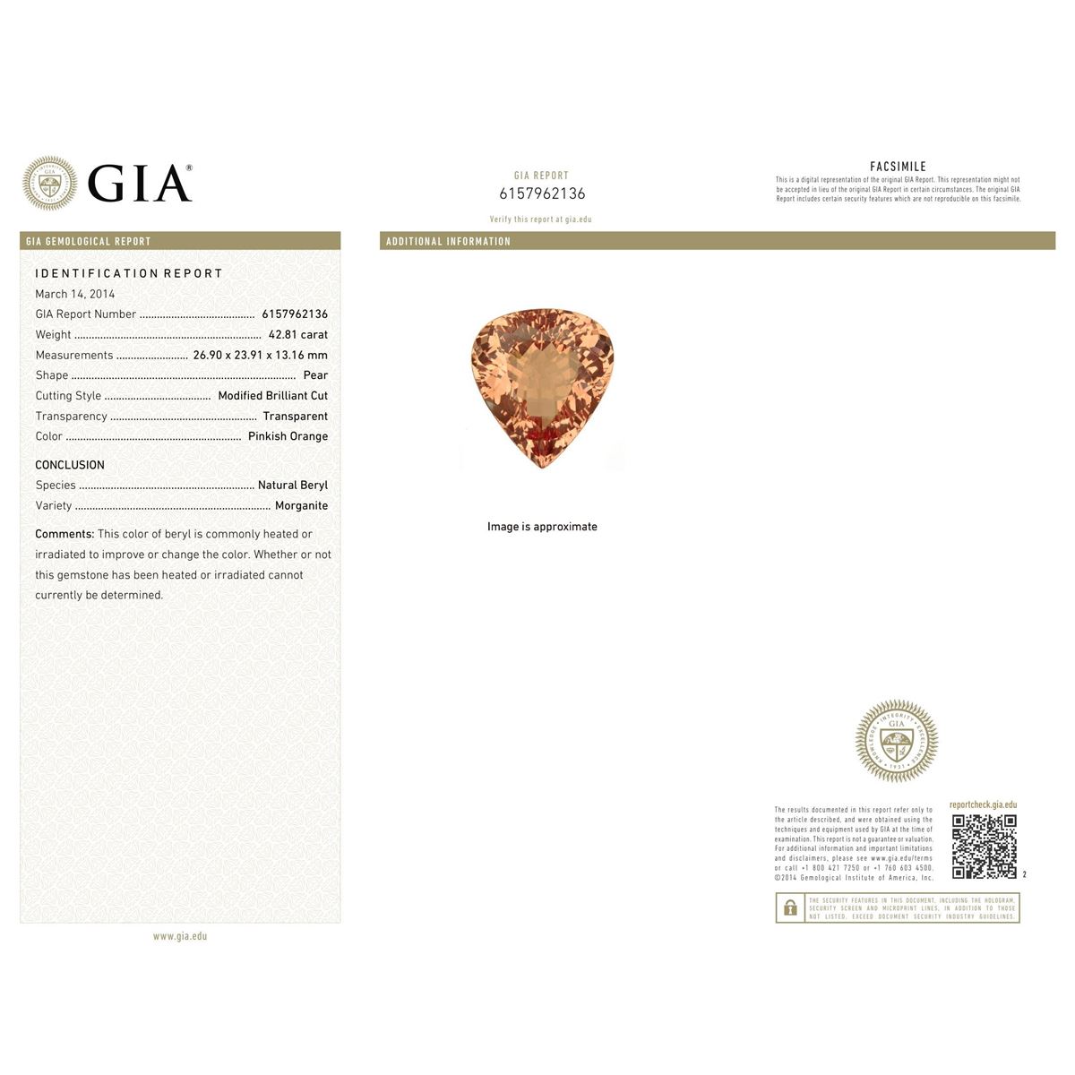 One electronically tested 14KT rose gold lady's combination cast & assembled necklace with a hidden box clasp with a bright polish finish. Condition is new. Identified with markings of "K14". Containing: One prong set pear modified brilliant cut natural morganite, measuring 26.90 x 23.91 x 13.16mm, approximate weight of 42.81ct., clarity is eye clean, type I, light, slightly brownish, reddish orange color, (GIA rO 3/2), cut is good. GIA REPORT: 6157962136. One Hundred Fifty-Seven prong set round brilliant cut diamonds, measuring 1.80 - 1.80 x 1.08mm (depth est.) approximate. Total Weight of 157 Stones = 3.34ct. Clarity: SI-2 to I-2. Color: I - K, Cut is Good. Twenty-One prong set round brilliant cut diamonds, measuring 4.50 - 3.00. x 2.25mm (depth est.) approximate. Total Weight of 21 Stones = 4.05ct. Clarity: SI-1 to I-1. Color: K - L, Cut is Good. Forty-Six prong set round brilliant cut diamonds, measuring 2.60 - 2.80 x 1.62mm (depth est.) approximate. Total Weight of 46 Stones = 3.31ct. Clarity: SI-2 to I-1. Color: K - L, Cut is Good. Colored gemstones are presumed to have been subjected to commonly used enhancement processes. All diamonds and colored gemstones are graded in the mounting, unless otherwise stated. Total Weight of Colored Stones 42.81ct. Total Weight of Diamonds 10.71ct. Total Weight of Necklace 45.10 grams. GGL Appraised at $48,255.00.