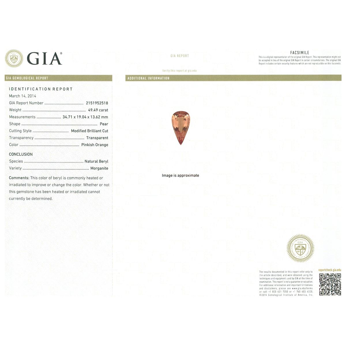 One electronically tested 14KT rose gold ladies cast & assembled morganite and diamond pendant with chain. The pendant features a morganite set within an elaborate diamond gallery, completed by a diamond set bail. The pendant is supported by a seventeen and one-quarter inch length flexible diamond chain, terminating in a hidden clasp with safety bar. Bright polish finish. Condition is new, good workmanship. Containing: One prong set pear modified brilliant cut natural morganite, measuring 34.71 x 19.04 x 13.62mm, exact weight 49.49ct., type I Clarity is eye clean, medium dark, very slightly brownish, pinkish orange color, (GIA piO 6/3), cut is good. Transmitting light with no distortion, transparent. GIA Gemological Report attached. Graded loose prior to setting in the GIA Laboratory, Report #2151952518.Thirty-Three prong set round brilliant cut diamonds, measuring 3.90 - 3.40 x 2.19mm (depth est.) approximate total weight of 33 Stones = 5.90ct. Graded in the setting. Clarity: SI-1 to I-1. Color: H - J Eighteen prong set round brilliant cut diamonds, measuring 2.30 - 1.90 x 1.26mm (depth est.) approximate total weight of 18 Stones = 0.65ct. Graded in the setting. Clarity: SI-1 to I-1. Color: H - J Twenty-Four prong set round brilliant cut diamonds, measuring 1.60 - 1.20 x 0.84mm (depth est.) approximate total weight of 24 Stones = 0.30ct. Graded in the setting. Clarity: SI-1 to I-1. Color: H - J One Hundred Fifty-Six prong set round brilliant cut diamonds, measuring 2.20 - 2.10 x 1.29mm (depth est.) approximate total weight of 156 Stones = 5.76ct. Graded in the setting. Clarity: SI-1 to I-1. Color: H - J. Total Weight of Colored Stones 49.49ct. Total Weight of Diamonds 12.61ct. Total Weight of Pendant With Chain 57.41 grams. AIG Appraised at $78,835.00.