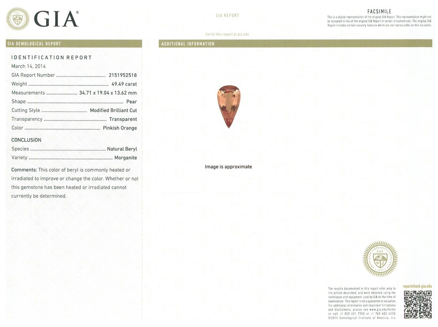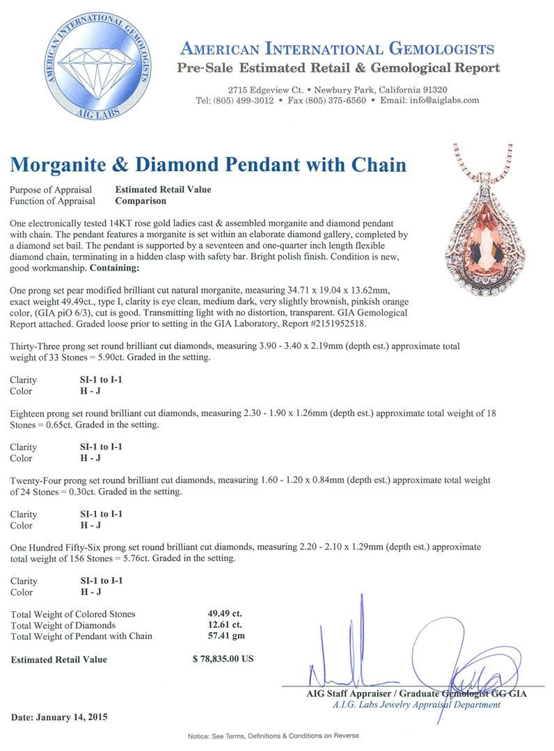 One electronically tested 14KT rose gold ladies cast & assembled morganite and diamond pendant with chain. The pendant features a morganite set within an elaborate diamond gallery, completed by a diamond set bail. The pendant is supported by a seventeen and one-quarter inch length flexible diamond chain, terminating in a hidden clasp with safety bar. Bright polish finish. Condition is new, good workmanship. Containing: One prong set pear modified brilliant cut natural morganite, measuring 34.71 x 19.04 x 13.62mm, exact weight 49.49ct., type I Clarity is eye clean, medium dark, very slightly brownish, pinkish orange color, (GIA piO 6/3), cut is good. Transmitting light with no distortion, transparent. GIA Gemological Report attached. Graded loose prior to setting in the GIA Laboratory, Report #2151952518.Thirty-Three prong set round brilliant cut diamonds, measuring 3.90 - 3.40 x 2.19mm (depth est.) approximate total weight of 33 Stones = 5.90 ct. Graded in the setting. Clarity: SI-1 to I-1. Color: H - J Eighteen prong set round brilliant cut diamonds, measuring 2.30 - 1.90 x 1.26mm (depth est.) approximate total weight of 18 Stones = 0.65ct. Graded in the setting. Clarity: SI-1 to I-1. Color: H - J Twenty-Four prong set round brilliant cut diamonds, measuring 1.60 - 1.20 x 0.84mm (depth est.) approximate total weight of 24 Stones = 0.30 ct. Graded in the setting. Clarity: SI-1 to I-1. Color: H - J One Hundred Fifty-Six prong set round brilliant cut diamonds, measuring 2.20 - 2.10 x 1.29mm (depth est.) approximate total weight of 156 Stones = 5.76ct. Graded in the setting. Clarity: SI-1 to I-1. Color: H - J. Total Weight of Colored Stones 49.49ct. Total Weight of Diamonds 12.61ct. Total Weight of Pendant With Chain 57.41 grams. AIG Appraised.