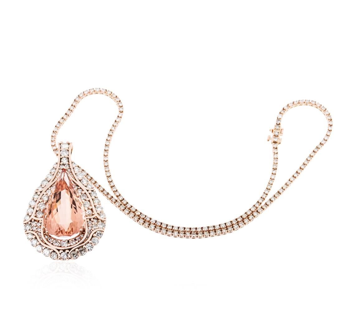 One electronically tested 14KT rose gold ladies cast & assembled morganite and diamond pendant with chain. The pendant features a morganite set within an elaborate diamond gallery, completed by a diamond set bail. The pendant is supported by a seventeen and one-quarter inch length flexible diamond chain, terminating in a hidden clasp with safety bar. Bright polish finish. Condition is new, good workmanship. Containing: One prong set pear modified brilliant cut natural morganite, measuring 34.71 x 19.04 x 13.62mm, exact weight 49.49ct., type I Clarity is eye clean, medium dark, very slightly brownish, pinkish orange color, (GIA piO 6/3), cut is good. Transmitting light with no distortion, transparent. GIA Gemological Report attached. Graded loose prior to setting in the GIA Laboratory, Report #2151952518.Thirty-Three prong set round brilliant cut diamonds, measuring 3.90 - 3.40 x 2.19mm (depth est.) approximate total weight of 33 Stones = 5.90ct. Graded in the setting. Clarity: SI-1 to I-1. Color: H - J Eighteen prong set round brilliant cut diamonds, measuring 2.30 - 1.90 x 1.26mm (depth est.) approximate total weight of 18 Stones = 0.65ct. Graded in the setting. Clarity: SI-1 to I-1. Color: H - J Twenty-Four prong set round brilliant cut diamonds, measuring 1.60 - 1.20 x 0.84mm (depth est.) approximate total weight of 24 Stones = 0.30ct. Graded in the setting. Clarity: SI-1 to I-1. Color: H - J One Hundred Fifty-Six prong set round brilliant cut diamonds, measuring 2.20 - 2.10 x 1.29mm (depth est.) approximate total weight of 156 Stones = 5.76ct. Graded in the setting. Clarity: SI-1 to I-1. Color: H - J. Total Weight of Colored Stones 49.49ct. Total Weight of Diamonds 12.61ct. Total Weight of Pendant With Chain 57.41 grams. AIG Appraised at $78,835.00.