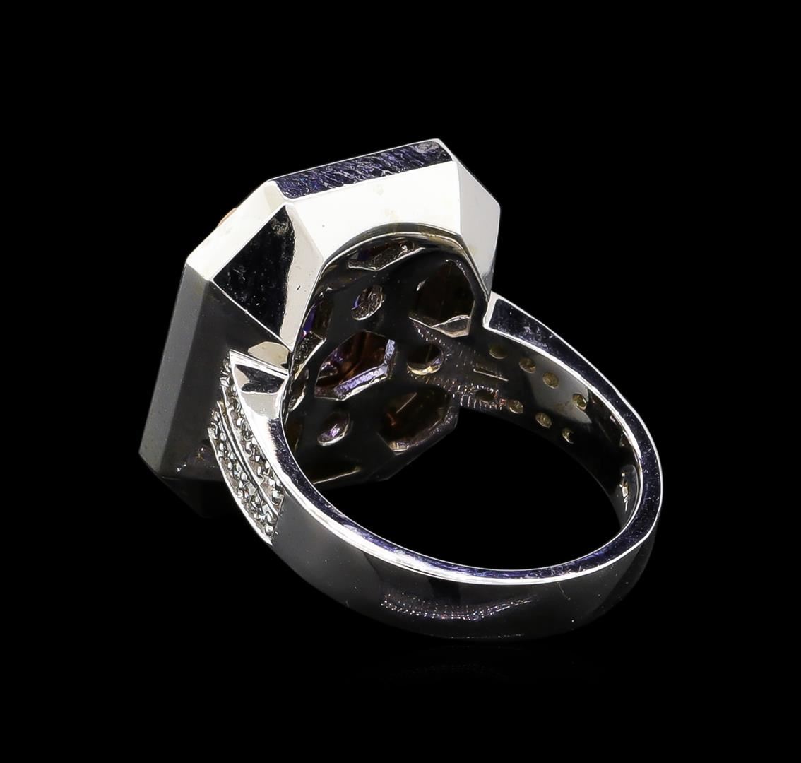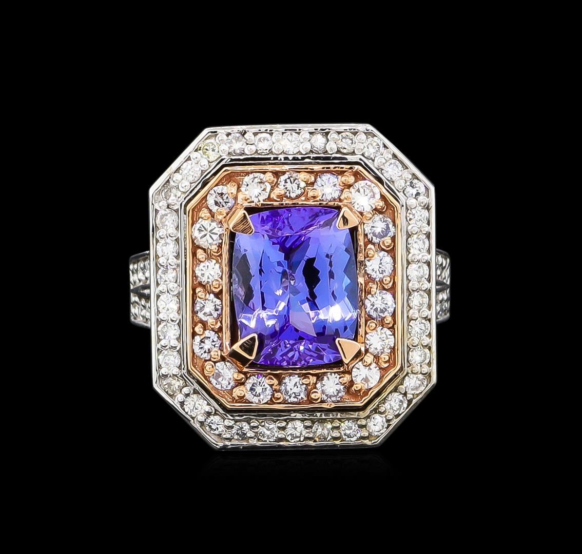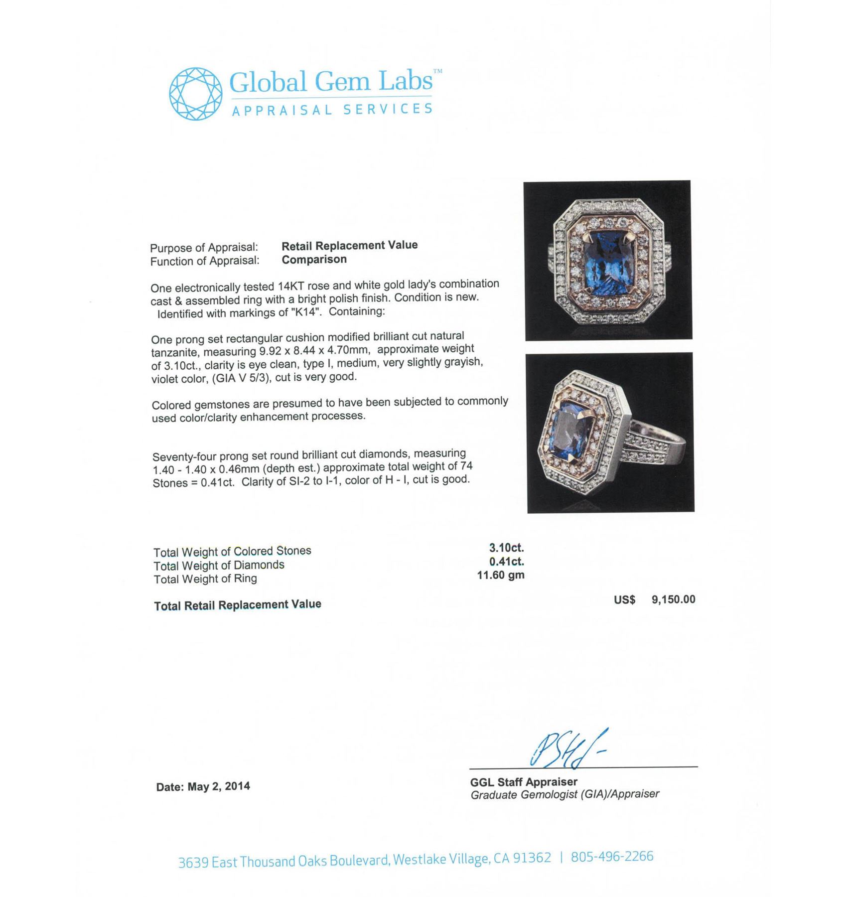One electronically tested 14KT rose and white gold Ladies combination cast & assembled ring with a bright polish finish. Condition is new. Identified with markings of "K14". Containing: One prong set rectangular cushion modified brilliant cut natural tanzanite, measuring 9.92 x 8.44 x 4.70mm, approximate weight of 3.10ct., clarity is eye clean, type I, medium, very slightly grayish, violet color, (GIA V 5/3), cut is very good. Colored gemstones are presumed to have been subjected to commonly used color/clarity enhancement processes. Seventy-Four prong set round brilliant cut diamonds, measuring 1.40 - 1.40 x 0.46mm (depth est.) approximate. Total Weight of 74 Stones = 0.41ct. Clarity: SI-2 to I-1. Color: H - I, Cut is Good. Total Weight of Colored Stones 3.10ct. Total Weight of Diamonds 0.41ct. Total Weight of Ring 11.60 grams. GGL Appraised at $9,150.00.
