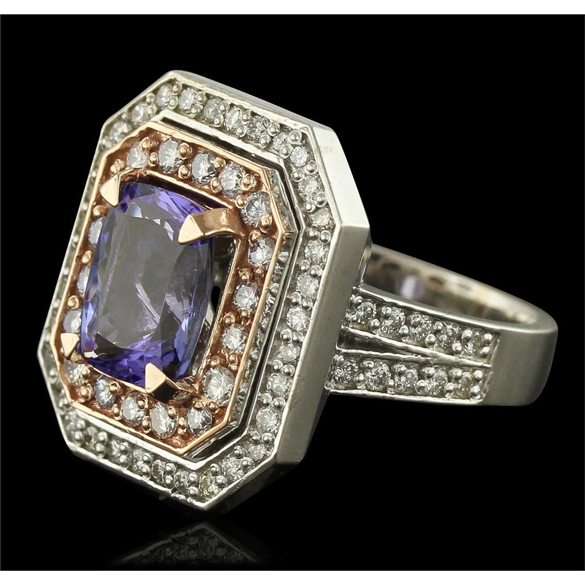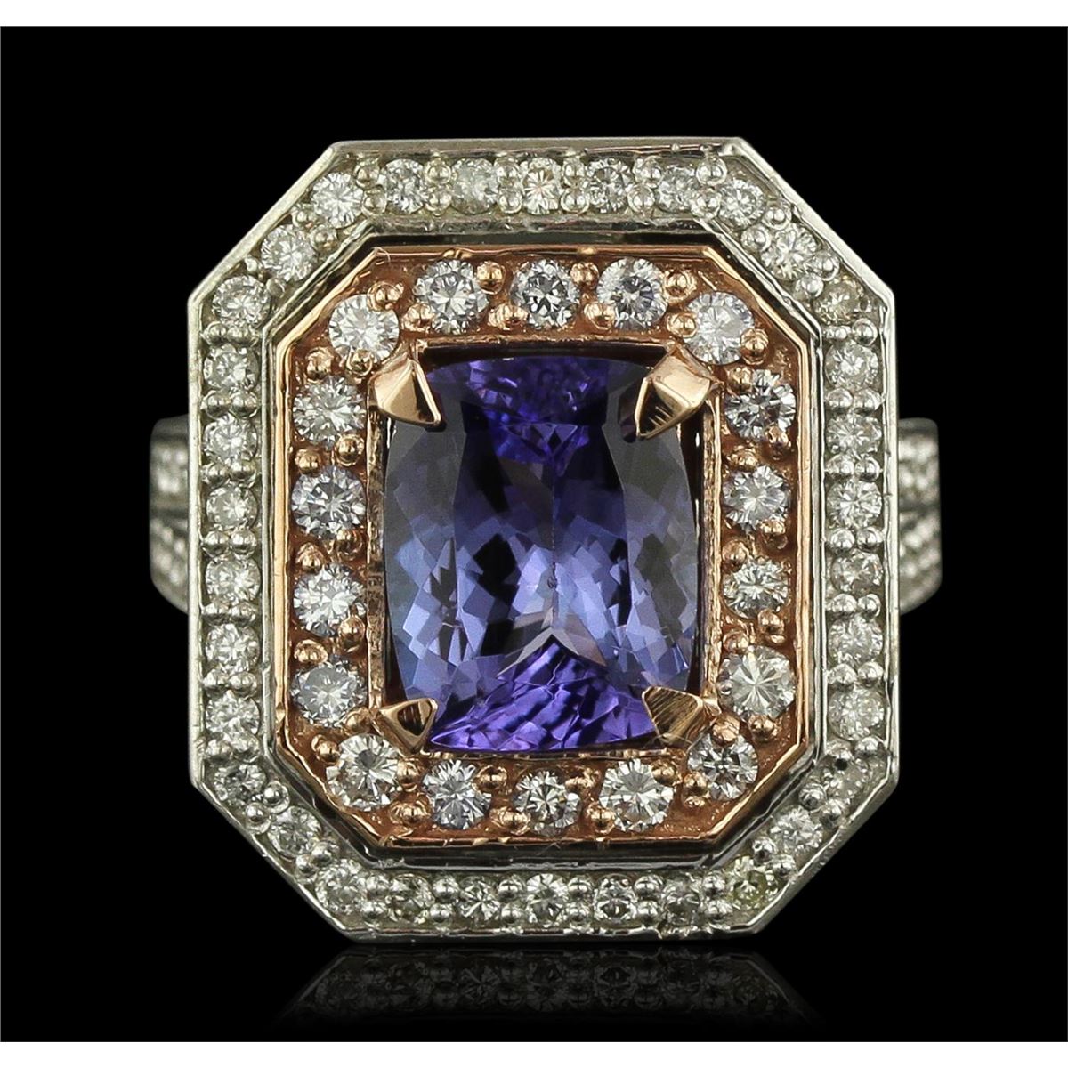 One electronically tested 14KT rose and white gold Ladies combination cast & assembled ring with a bright polish finish. Condition is new. Identified with markings of "K14". Containing: One prong set rectangular cushion modified brilliant cut natural tanzanite, measuring 9.92 x 8.44 x 4.70mm, approximate weight of 3.10ct., clarity is eye clean, type I, medium, very slightly grayish, violet color, (GIA V 5/3), cut is very good. Colored gemstones are presumed to have been subjected to commonly used color/clarity enhancement processes. Seventy-Four prong set round brilliant cut diamonds, measuring 1.40 - 1.40 x 0.46mm (depth est.) approximate. Total Weight of 74 Stones = 0.41ct. Clarity: SI-2 to I-1. Color: H - I, Cut is Good. Total Weight of Colored Stones 3.10ct. Total Weight of Diamonds 0.41ct. Total Weight of Ring 11.60 grams. GGL Appraised at $9,150.00.