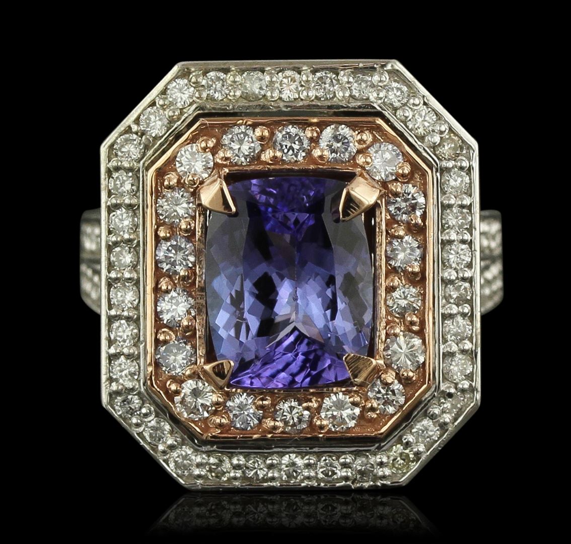 One electronically tested 14KT rose and white gold Ladies combination cast & assembled ring with a bright polish finish. Condition is new. Identified with markings of "K14". Containing: One prong set rectangular cushion modified brilliant cut natural tanzanite, measuring 9.92 x 8.44 x 4.70mm, approximate weight of 3.10ct., clarity is eye clean, type I, medium, very slightly grayish, violet color, (GIA V 5/3), cut is very good. Colored gemstones are presumed to have been subjected to commonly used color/clarity enhancement processes. Seventy-Four prong set round brilliant cut diamonds, measuring 1.40 - 1.40 x 0.46mm (depth est.) approximate. Total Weight of 74 Stones = 0.41ct. Clarity: SI-2 to I-1. Color: H - I, Cut is Good. Total Weight of Colored Stones 3.10ct. Total Weight of Diamonds 0.41ct. Total Weight of Ring 11.60 grams. GGL Appraised at $9,150.00.