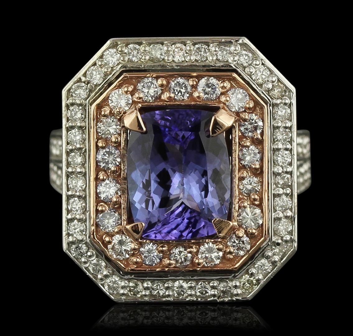 One electronically tested 14KT rose and white gold Ladies combination cast & assembled ring with a bright polish finish. Condition is new. Identified with markings of "K14". Containing: One prong set rectangular cushion modified brilliant cut natural tanzanite, measuring 9.92 x 8.44 x 4.70mm, approximate weight of 3.10ct., clarity is eye clean, type I, medium, very slightly grayish, violet color, (GIA V 5/3), cut is very good. Colored gemstones are presumed to have been subjected to commonly used color/clarity enhancement processes. Seventy-Four prong set round brilliant cut diamonds, measuring 1.40 - 1.40 x 0.46mm (depth est.) approximate. Total Weight of 74 Stones = 0.41ct. Clarity: SI-2 to I-1. Color: H - I, Cut is Good. Total Weight of Colored Stones 3.10ct. Total Weight of Diamonds 0.41ct. Total Weight of Ring 11.60 grams. GGL Appraised at $9,150.00.