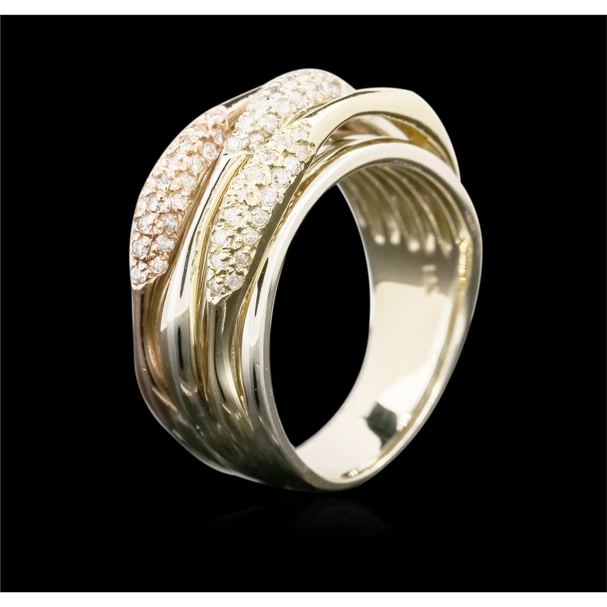 One electronically tested 14KT rose, yellow and white gold ladies combination cast & assembled diamond ring with a bright polish finish. Identified with markings of "14K". Condition is new. Containing: Seventy-Five prong set round brilliant cut diamonds, measuring 1.00 - 1.00 x 0.60mm (depth est.) approximate total weight of 75 Stones = 0.27ct. Clarity: I-1 to I-2. Color: I - J, Cut is Good. All diamonds are graded in the mounting, unless otherwise stated. Total Weight of Diamonds 0.27ct. Total Weight of Ring 9.10 grams. GGL Appraised at $3,500.00.