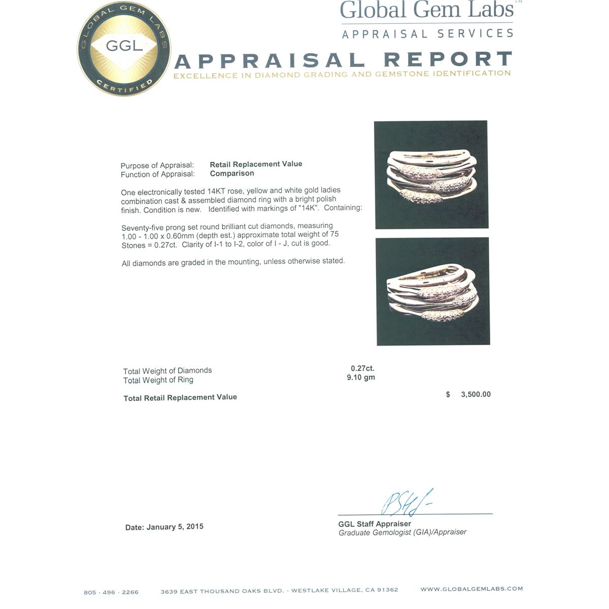One electronically tested 14KT rose, yellow and white gold ladies combination cast & assembled diamond ring with a bright polish finish. Identified with markings of "14K". Condition is new. Containing: Seventy-Five prong set round brilliant cut diamonds, measuring 1.00 - 1.00 x 0.60mm (depth est.) approximate total weight of 75 Stones = 0.27ct. Clarity: I-1 to I-2. Color: I - J, Cut is Good. All diamonds are graded in the mounting, unless otherwise stated. Total Weight of Diamonds 0.27ct. Total Weight of Ring 9.10 grams. GGL Appraised at $3,500.00.