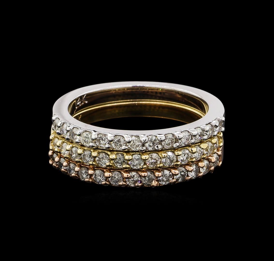 Three electronically tested 14KT rose, yellow and white gold ladies cast diamond wedding bands with a bright polish finish. Identified with markings of "14K". Condition is new. Containing: Thirty-Nine prong set round brilliant cut diamonds, measuring 1.70 - 1.70 x 1.02mm (depth est.) approximate total weight of 39 St ones = 0.70ct. Clarity: SI-2 to I-1. Color: I - J, Cut is Good. All diamonds are graded in the mounting, unless otherwise stated. Total Weight of Diamonds 0.70ct. Total Weight of Wedding Bands 7.50 grams. GGL Appraised at $4,530.00.