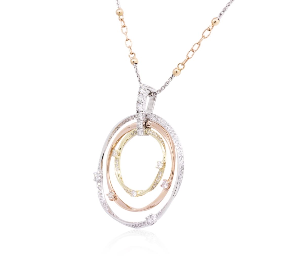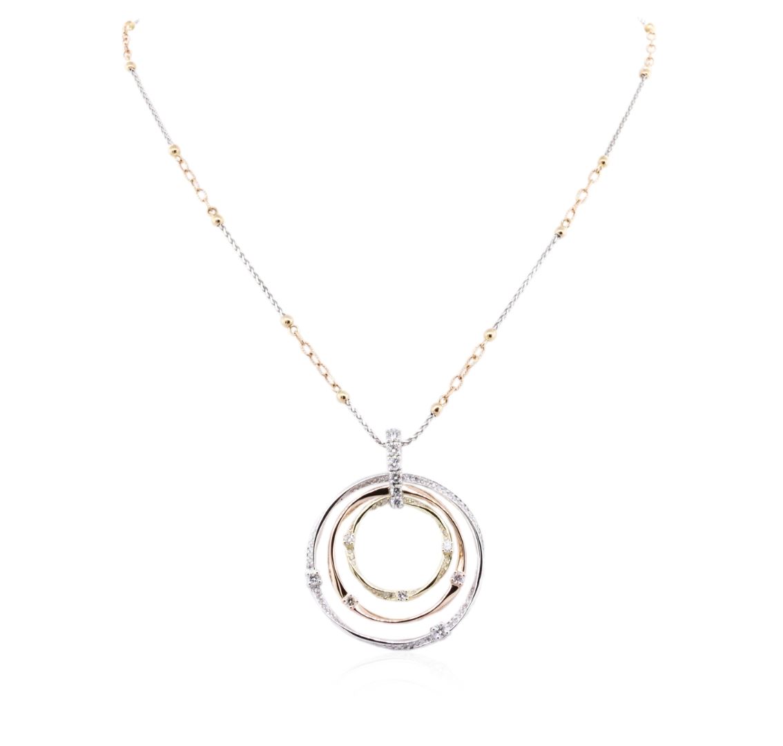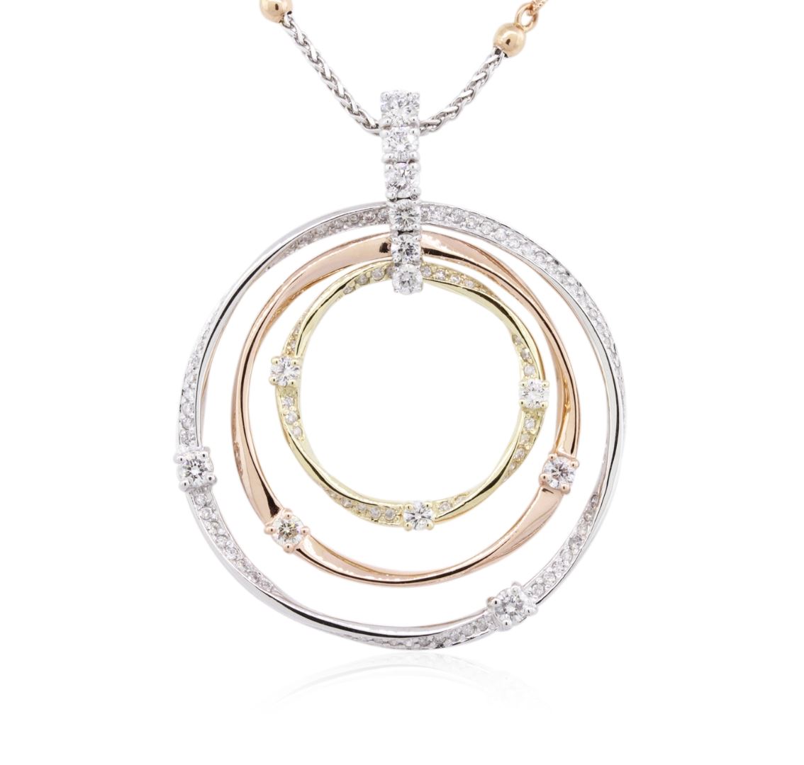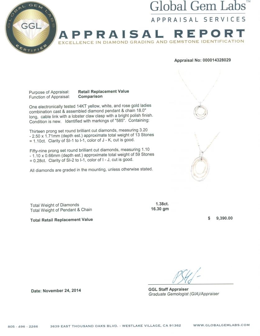 One electronically tested 14KT yellow, white, and rose gold ladies combination cast & assembled diamond pendant & chain 18.0" long, cable link with a lobster claw clasp with a bright polish finish. Identified with markings of "585". Condition is new. Containing: Thirteen prong set round brilliant cut diamonds, measuring 3.20 - 2.50 x 1.71mm (depth est.) approximate total weight of 13 Stones = 1.10ct. Clarity: SI-1 to I-1. Color: J - K, Cut is Good. Fifty-Nine prong set round brilliant cut diamonds, measuring 1.10 - 1.10 x 0.66mm (depth est.) approximate total weight of 59 Stones = 0.28ct. Clarity: SI-2 to I-1. Color: I - J, Cut is Good. All diamonds are graded in the mounting, unless otherwise stated. Total Weight of Diamonds 1.38ct. Total Weight of Pendant & Chain 16.30 grams. GGL Appraised at $9,390.00.