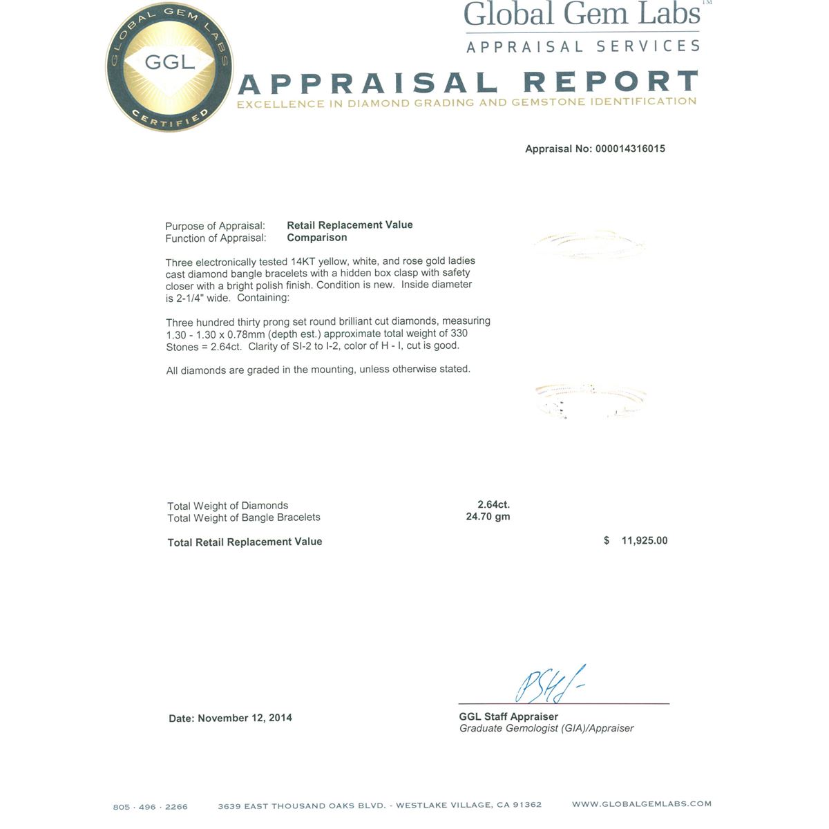 Three electronically tested 14KT yellow, white, and rose gold ladies cast diamond bangle bracelets with a hidden box clasp with safety closer with a bright polish finish. Condition is new. Inside diameter is 2-1/4 inches wide. Containing: Three hundred thirty prong set round brilliant cut diamonds, measuring 1.30 - 1.30 x 0.78mm (depth est.) approximate total weight of 330 Stones = 2.64ct. Clarity: SI-2 to I-2. Color: H - I, Cut is Good. All diamonds are graded in the mounting, unless otherwise stated. Total Weight of Diamonds 2.64ct. Total Weight of Bangle Bracelets 24.70 grams. GGL Appraised at $11,925.00.