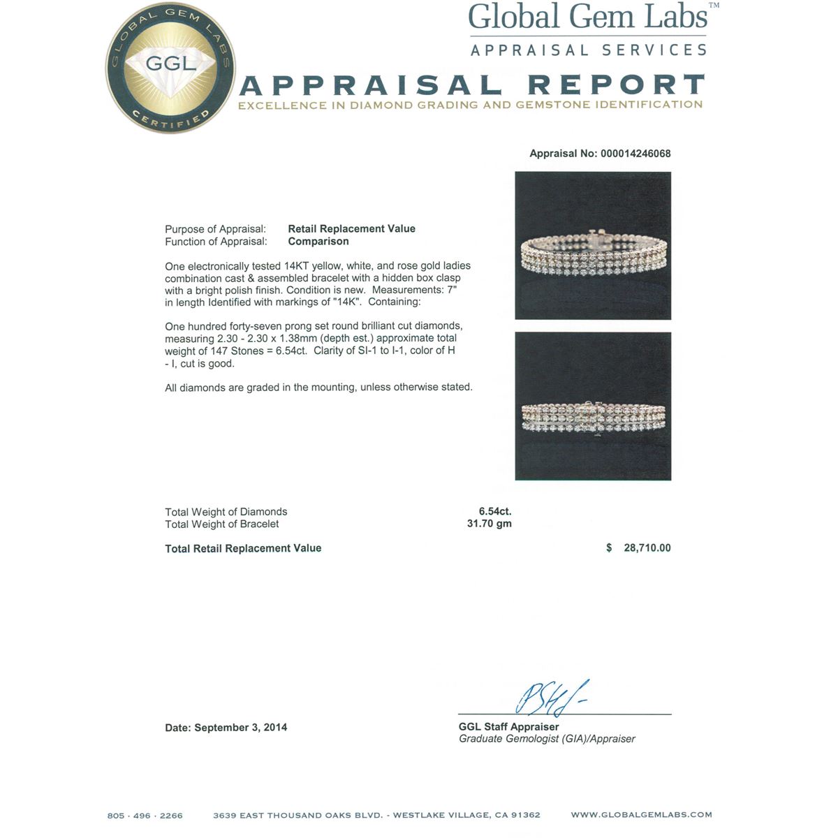 One electronically tested 14KT yellow, white, and rose gold ladies combination cast & assembled bracelet with a hidden box clasp with a bright polish finish. Measurements: 7" in length Identified with markings of "14K". Condition is new. Containing: One Hundred Forty-Seven prong set round brilliant cut diamonds, measuring 2.30 - 2.30 x 1.38mm (depth est.) approximate total weight of 147 Stones = 6.54ct. Clarity: SI-1 to I-1. Color: H - I, Cut is Good. All diamonds are graded in the mounting, unless otherwise stated. Total Weight of Diamonds 6.54ct. Total Weight of Bracelet 31.70 grams. GGL Appraised at $28,710.00.