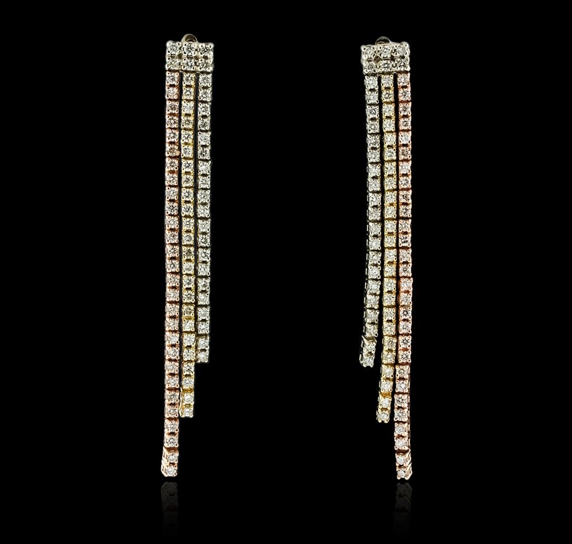 One pair electronically tested 14KT rose, yellow and white gold ladies cast diamond earrings with friction posts with a bright polish finish. Identified with markings of "14K". Condition is new. Containing: One Hundred Fifty-Six prong set round brilliant cut diamonds, measuring 1.10 - 1.10 x 0.66mm (depth est.) approximate total weight of 156 Stones = 0.75ct. Clarity: I-1 to I-2. Color: J - K, Cut is Good. All diamonds are graded in the mounting, unless otherwise stated. Total Weight of Diamonds 0.75ct. Total Weight of Earrings 7.80 grams. GGL Appraised at $3,325.00.