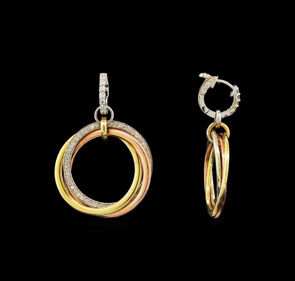 One pair electronically tested 14KT rose, yellow and white gold ladies cast diamond earrings with hinged clip backs with a bright polish finish. Identified with markings of "K14". Condition is new. Containing: One Hundred Twelve prong set round brilliant cut diamonds, measuring 1.30 - 1.30 x 0.78mm (depth est.) approximate total weight of 112 Stones = 0.90ct. Clarity: SI-2 to I-1. Color: I - J, Cut is Good. All diamonds are graded in the mounting, unless otherwise stated. Total Weight of Diamonds 0.90ct. Total Weight of Earrings 18.00 grams. GGL Appraised at $6,070.00.