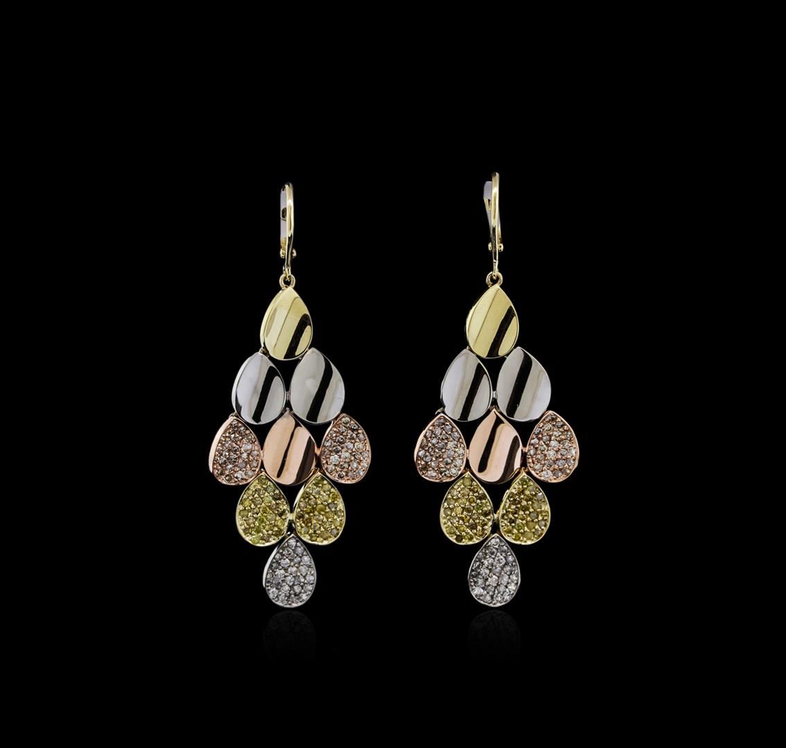 One pair electronically tested 14KT yellow, white, and rose gold ladies cast diamond earrings with lever backs with a bright polish finish. Identified with markings of "14K". Condition is new. Containing: Ninety-Four prong set single cut diamonds, measuring 1.20 - 1.00 x 0.60mm (depth est.) approximate total weight of 94 Stones = 0.87ct. Clarity: SI-1 to I-1, Cut is Good. Color of the stones has been treated. One Hundred Thirty-Eight prong set single cut diamonds, measuring 1.40 - 1.10 x 0.66mm (depth est.) approximate total weight of 138 Stones = 1.36ct. Clarity: SI-1 to I-1. Color: I - J, Cut is Good. Diamonds are graded in the mounting, unless otherwise stated. Total Weight of Diamonds 2.23ct. Total Weight of Earrings 11.70 grams. GGL Appraised at $3,615.00.