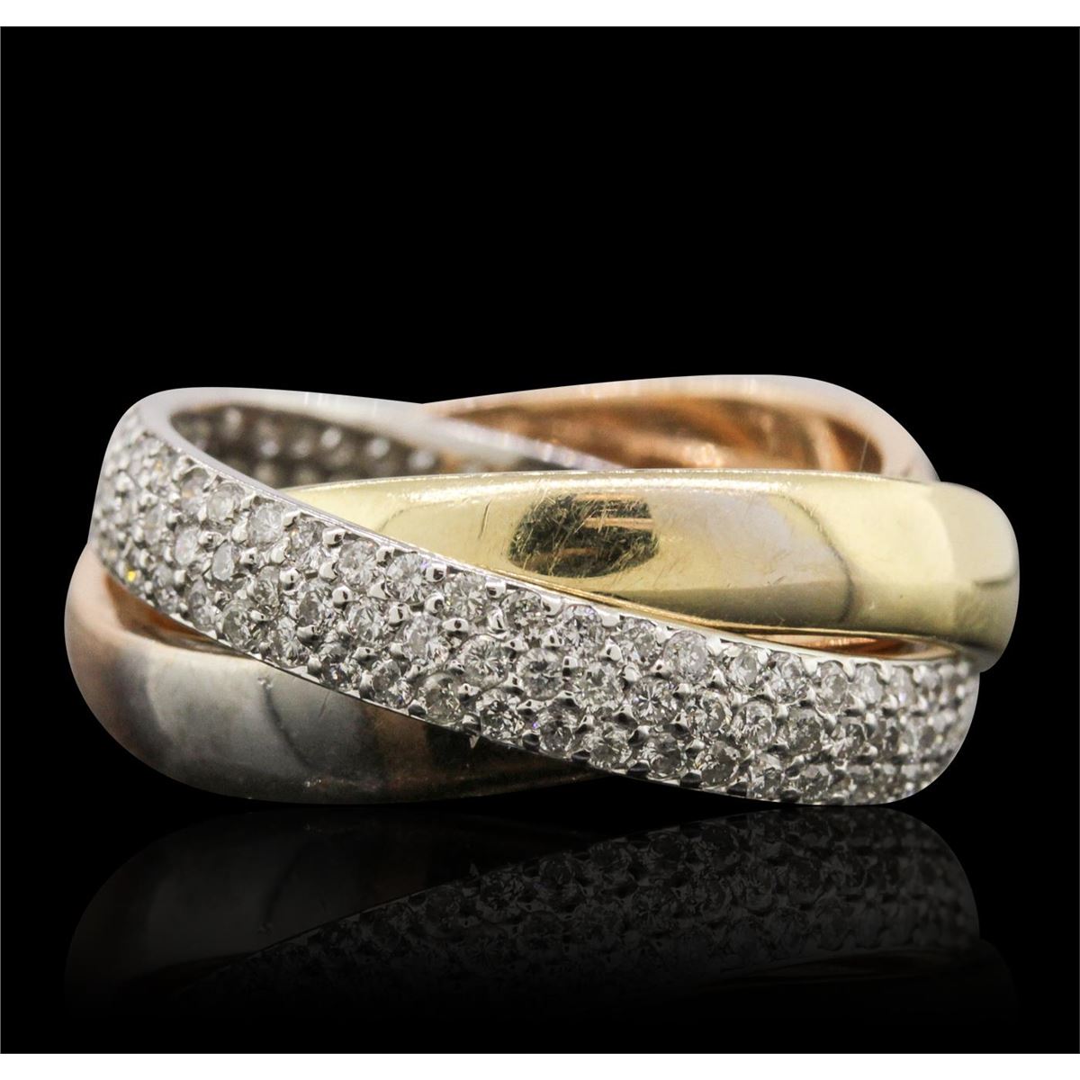 One electronically tested 14KT yellow, white, and rose gold Ladies combination cast & die struck unity ring with a bright polish finish. Condition is very good. Identified with markings of "14K". Containing: One Hundred Forty-One bead set round brilliant cut diamonds, measuring 1.20 - 1.20 x 0.72mm (depth est.) approximate. Total Weight of 141 Stones = 0.89ct. Clarity: I-1 to I-2. Color: H - I, Cut is Good. All diamonds are graded in the mounting, unless otherwise stated. Total Weight of Diamonds 0.89ct. Total Weight of Unity Ring 10.00 grams.. GGL Appraised at $6,425.00.