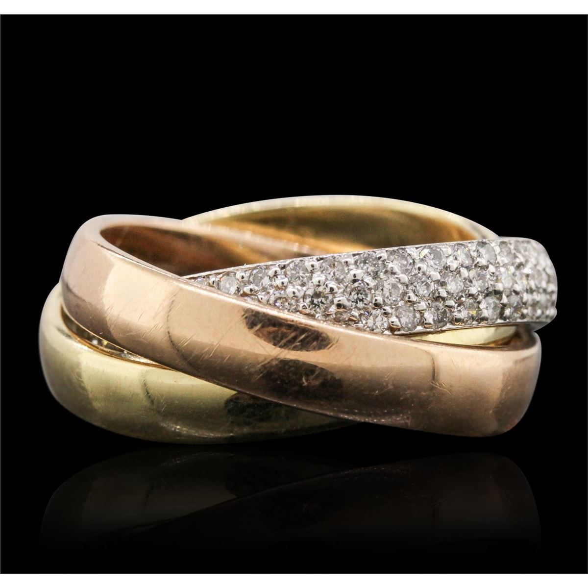 One electronically tested 14KT yellow, white, and rose gold Ladies combination cast & die struck unity ring with a bright polish finish. Condition is very good. Identified with markings of "14K". Containing: One Hundred Forty-One bead set round brilliant cut diamonds, measuring 1.20 - 1.20 x 0.72mm (depth est.) approximate. Total Weight of 141 Stones = 0.89ct. Clarity: I-1 to I-2. Color: H - I, Cut is Good. All diamonds are graded in the mounting, unless otherwise stated. Total Weight of Diamonds 0.89ct. Total Weight of Unity Ring 10.00 grams.. GGL Appraised at $6,425.00.