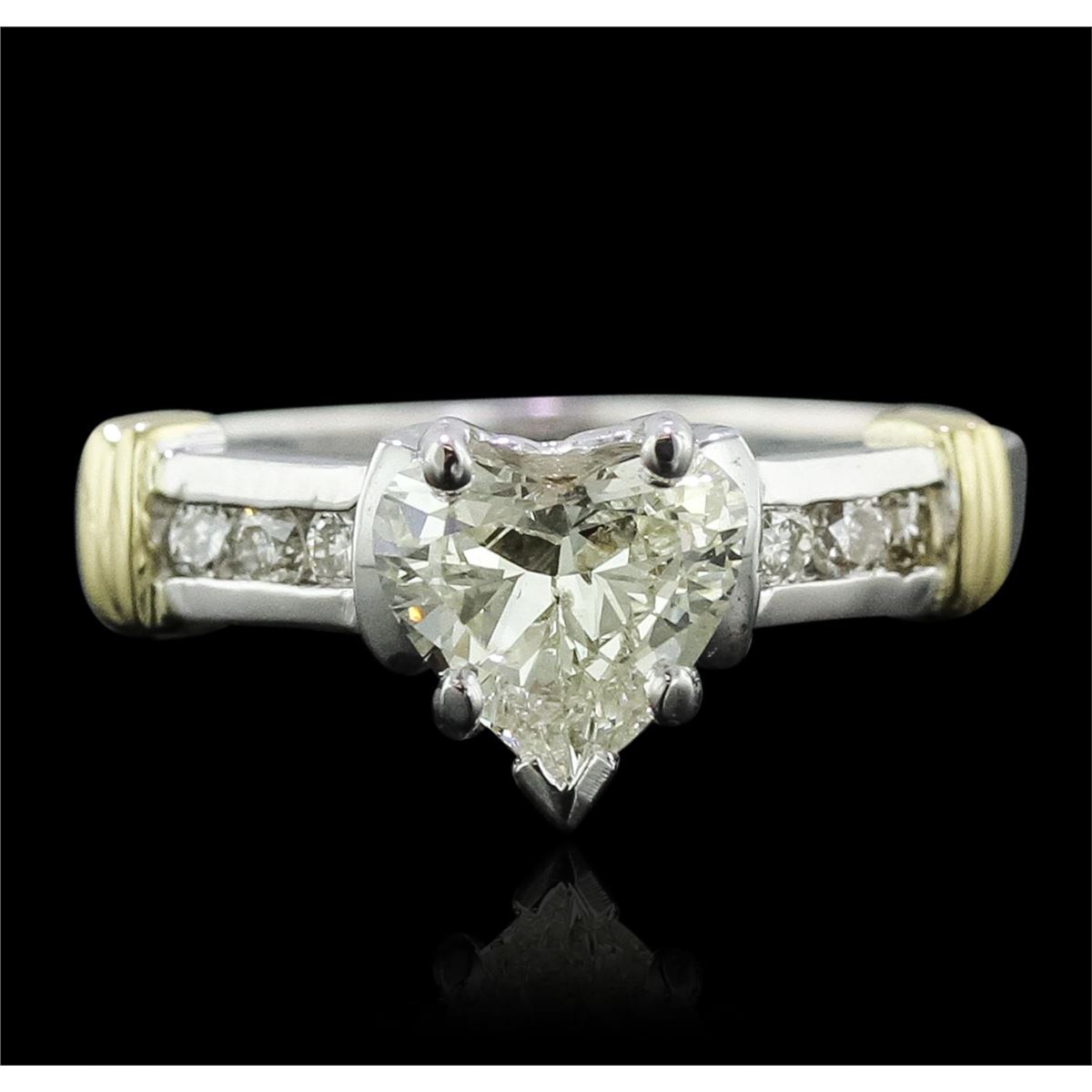 One electronically tested 14KT white and yellow gold Ladies combination cast & assembled engagement ring with a bright polish finish. Condition is new. Identified with markings of "14K". Containing: One prong set heart shaped cut diamond, measuring 7.40 x 6.50 x 4.10mm (depth est.) approximate weight of 1.16ct. Clarity: SI-1. Color: L, Cut is Good. Six channel set round brilliant cut diamonds, measuring 1.80 - 1.80 x 1.08mm (depth est.) approximate total weight of 6 Stones = 0.13ct. Clarity: SI-2. Color: I - J, Cut is Good. All diamonds are graded in the mounting, unless otherwise stated. Total Weight of Diamonds 1.29ct. Total Weight of Engagement Ring 4.30 grams. GGL Appraised at $9,815.00.
