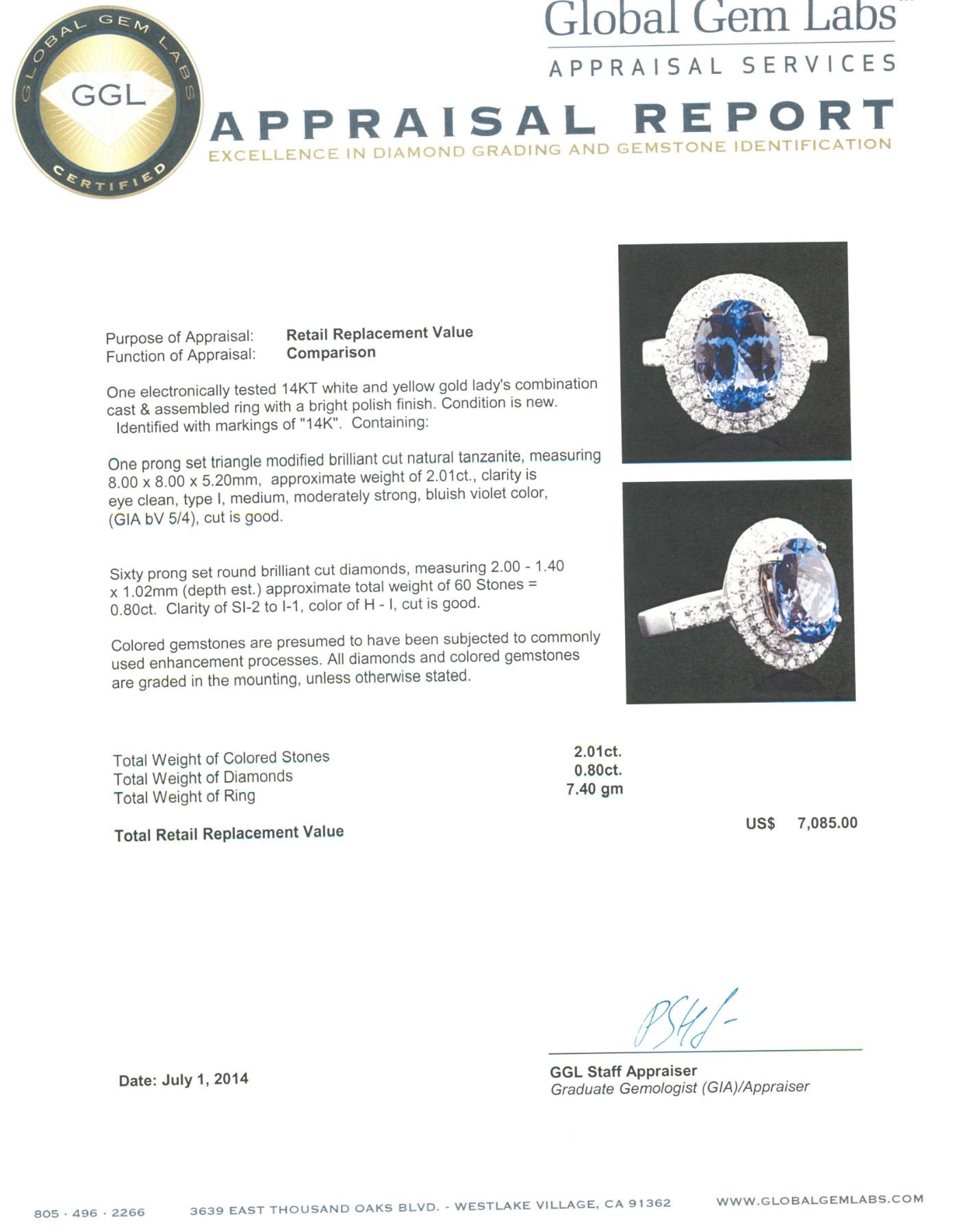 One electronically tested 14KT white and yellow gold Ladies combination cast & assembled ring with a bright polish finish. Condition is new. Identified with markings of "14K". Containing: One prong set triangle modified brilliant cut natural tanzanite, measuring 8.00 x 8.00 x 5.20mm, approximate weight of 2.01ct., clarity is eye clean, type I, medium, moderately strong, bluish violet color, (GIA bV 5/4), cut is good. Sixty prong set round brilliant cut diamonds, measuring 2.00 - 1.40 x 1.02mm (depth est.) approximate total weight of 60 Stones = 0.80 ct. Clarity: SI-2 to I-1. Color: H - I, Cut is Good. Colored gemstones are presumed to have been subjected to commonly used enhancement processes. All diamonds and colored gemstones are graded in the mounting, unless otherwise stated. Total Weight of Colored Stones 2.01ct. Total Weight of Diamonds 0.80 ct. Total Weight of Ring 7.40 grams. GGL Appraised.