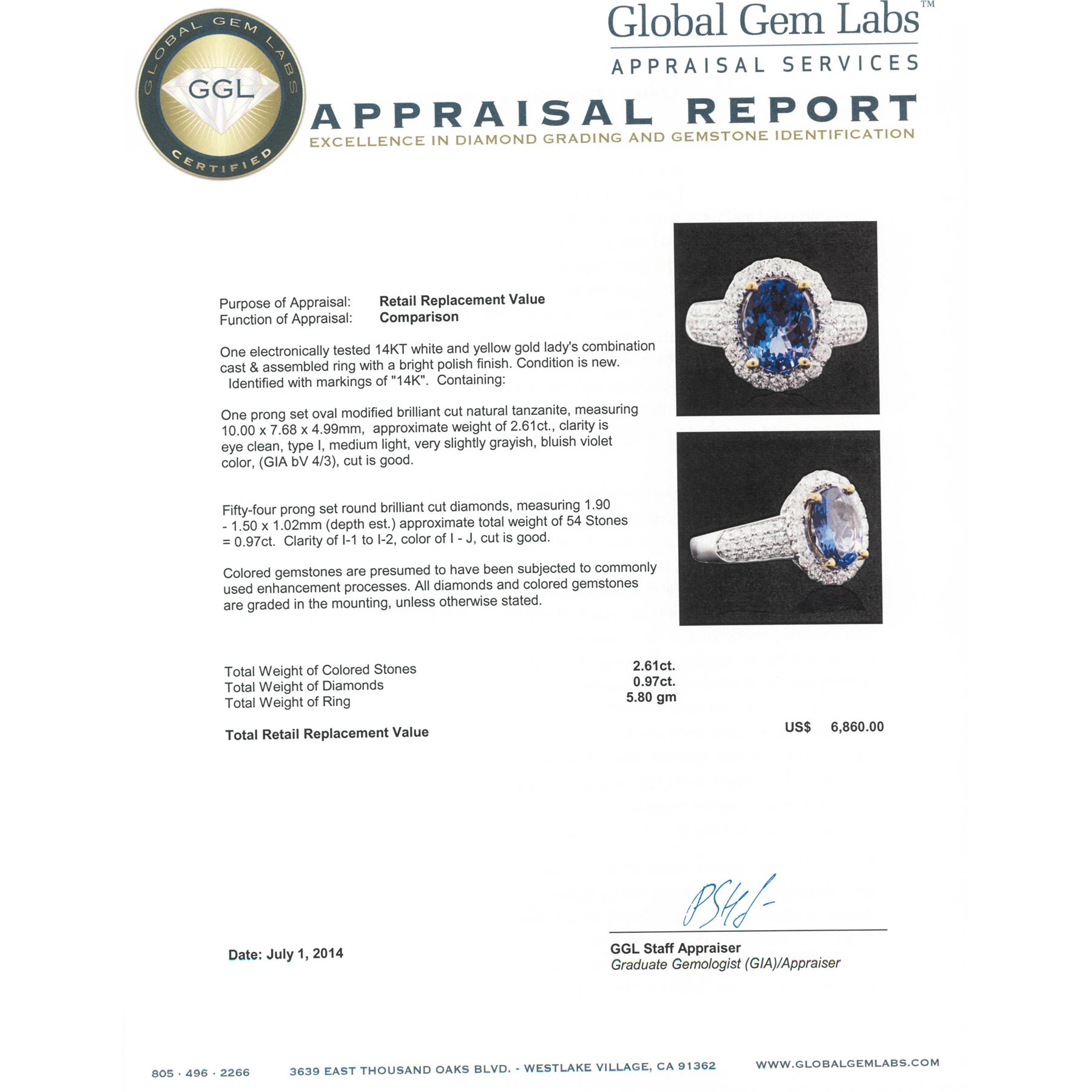 One electronically tested 14KT white and yellow gold Ladies combination cast & assembled ring with a bright polish finish. Condition is new. Identified with markings of "14K". Containing: One prong set oval modified brilliant cut natural tanzanite, measuring 10.00 x 7.68 x 4.99mm, approximate weight of 2.61ct., clarity is eye clean, type I, medium light, very slightly grayish, bluish violet color, (GIA bV 4/3), cut is good. Fifty-Four prong set round brilliant cut diamonds, measuring 1.90 - 1.50 x 1.02mm (depth est.) approximate total weight of 54 Stones = 0.97ct. Clarity: I-1 to I-2. Color: I - J, Cut is Good. Colored gemstones are presumed to have been subjected to commonly used enhancement processes. All diamonds and colored gemstones are graded in the mounting, unless otherwise stated. Total Weight of Colored Stones 2.61ct. Total Weight of Diamonds 0.97ct. Total Weight of Ring 5.80 grams. GGL Appraised.