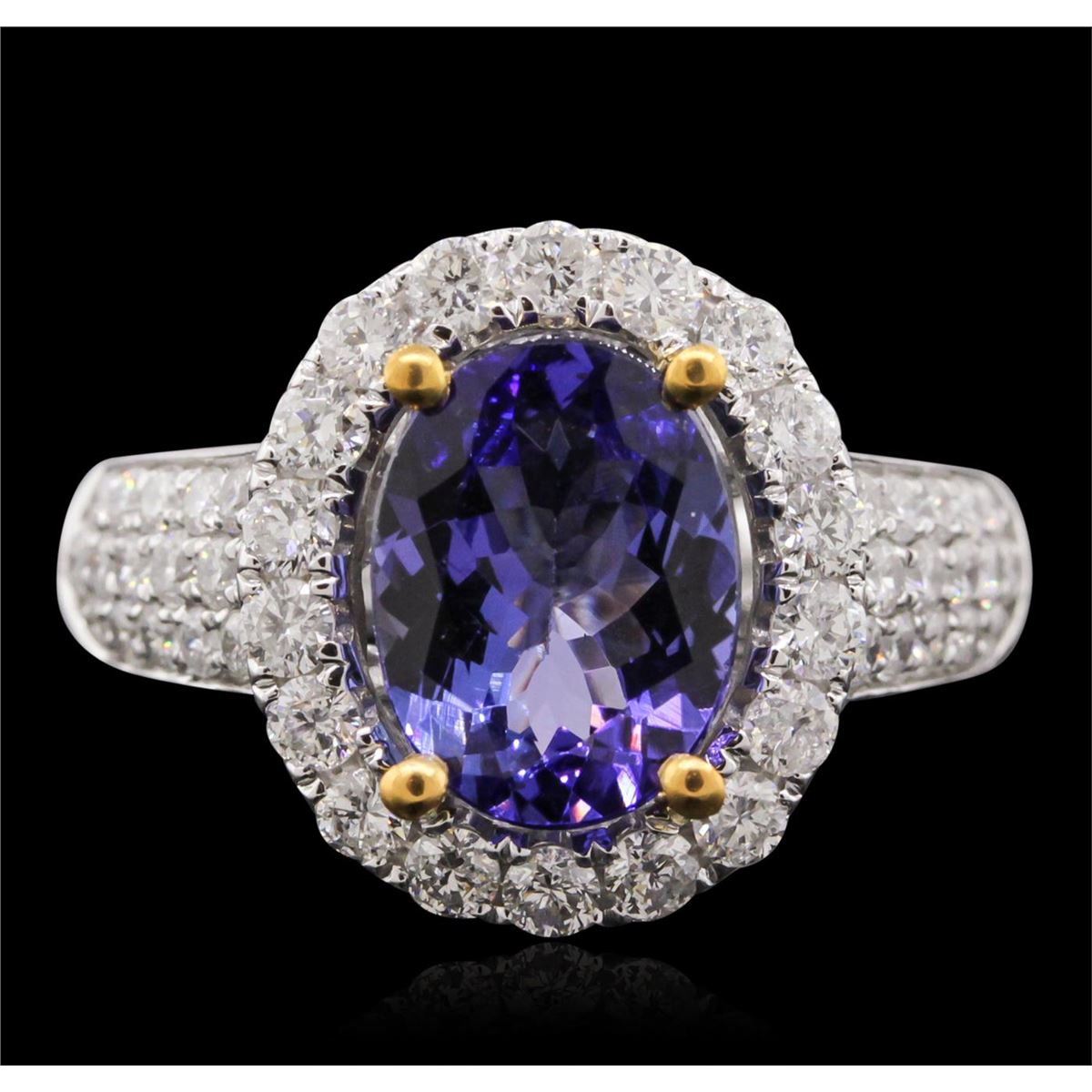One electronically tested 14KT white and yellow gold Ladies combination cast & assembled ring with a bright polish finish. Condition is new. Identified with markings of "14K". Containing: One prong set oval modified brilliant cut natural tanzanite, measuring 10.00 x 7.68 x 4.99mm, approximate weight of 2.61ct., clarity is eye clean, type I, medium light, very slightly grayish, bluish violet color, (GIA bV 4/3), cut is good. Fifty-Four prong set round brilliant cut diamonds, measuring 1.90 - 1.50 x 1.02mm (depth est.) approximate total weight of 54 Stones = 0.97ct. Clarity: I-1 to I-2. Color: I - J, Cut is Good. Colored gemstones are presumed to have been subjected to commonly used enhancement processes. All diamonds and colored gemstones are graded in the mounting, unless otherwise stated. Total Weight of Colored Stones 2.61ct. Total Weight of Diamonds 0.97ct. Total Weight of Ring 5.80 grams. GGL Appraised at $6,860.00.