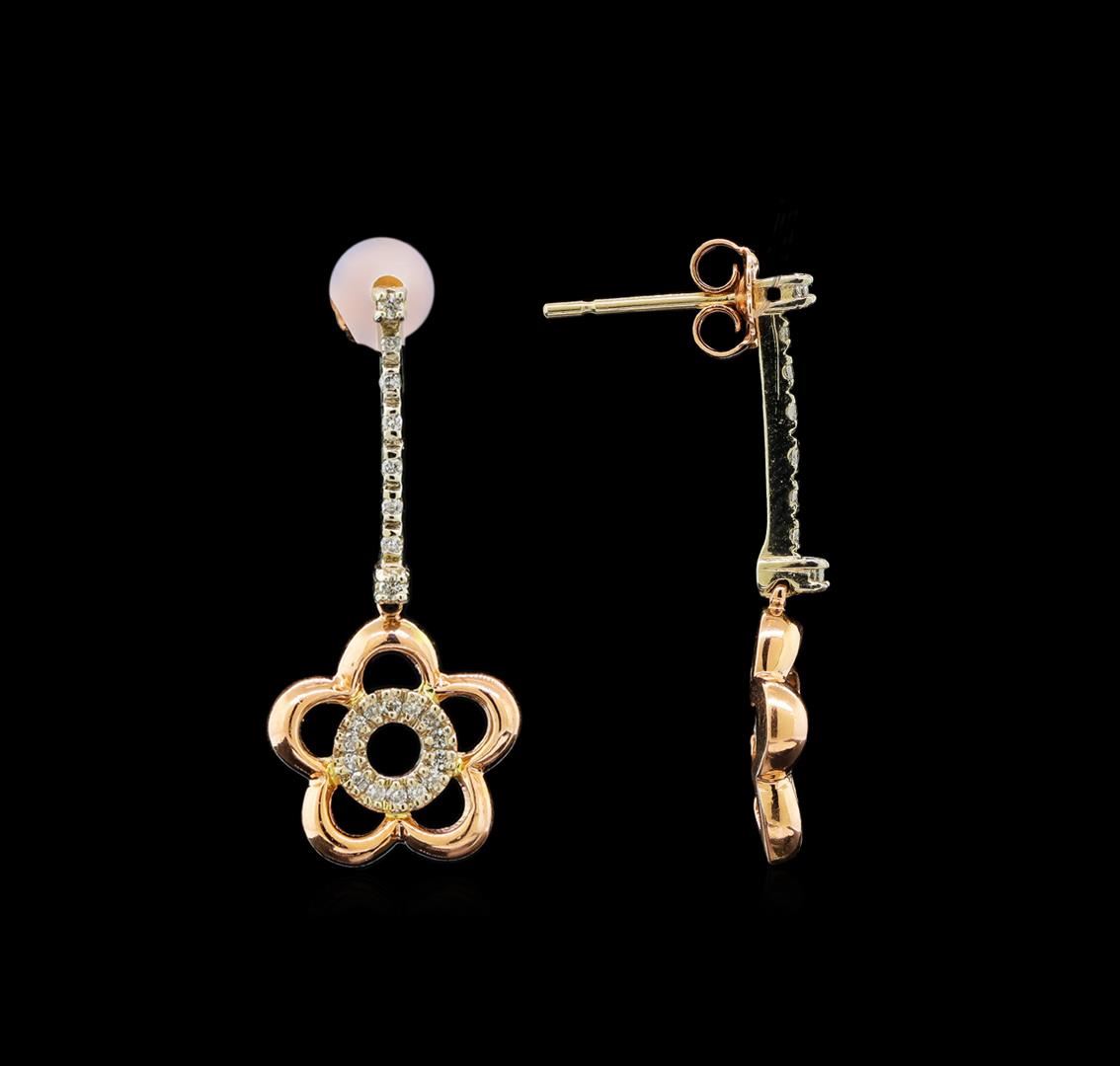 One pair electronically tested 14KT white and rose gold ladies cast diamond earrings with friction posts with a bright polish finish. Identified with markings of "14K". Condition is new. Containing: Forty-Four prong set round brilliant cut diamonds, measuring 0.90 - 0.90 x 0.54mm (depth est.) approximate total weight of 44 Stones = 0.11ct. Clarity: SI-1 to SI-2. Color: I - J, Cut is Good. All diamonds are graded in the mounting, unless otherwise stated. Total Weight of Diamonds 0.11ct. Total Weight of Earrings 4.90 grams. GGL Appraised at $1,210.00.