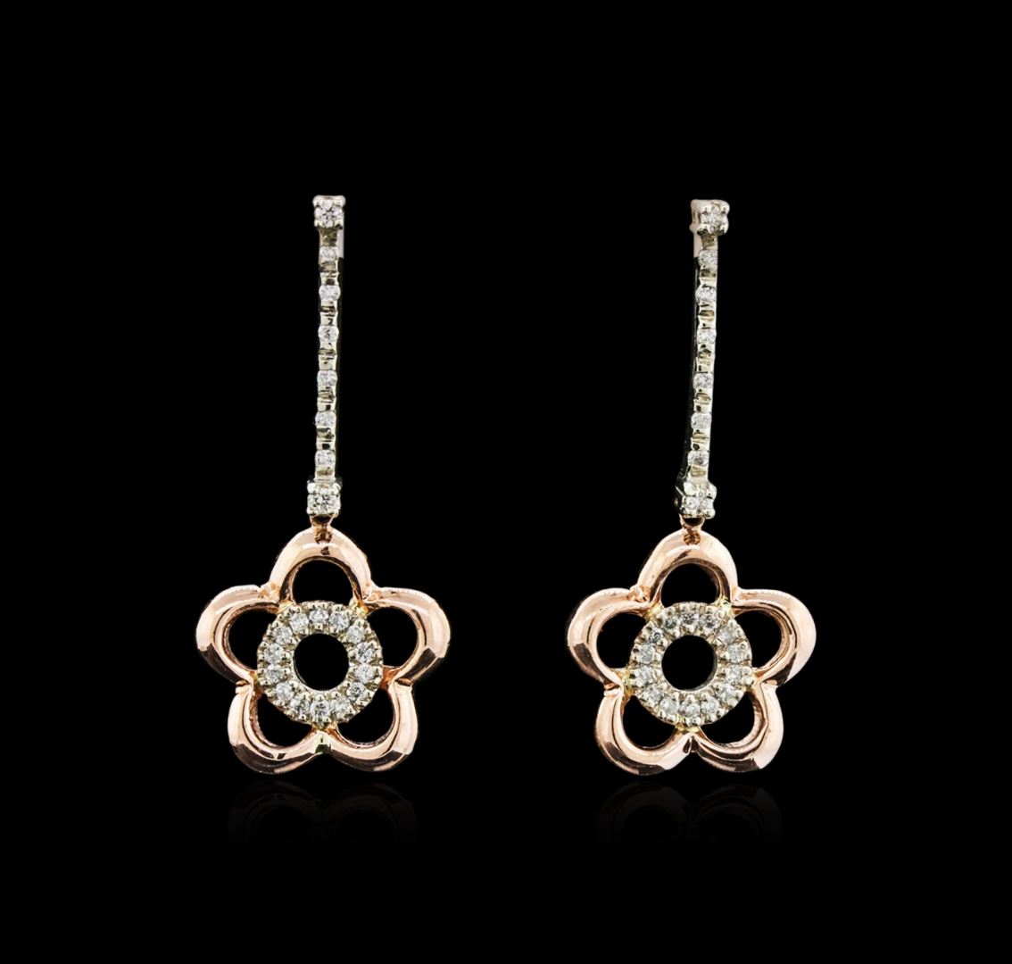 One pair electronically tested 14KT white and rose gold ladies cast diamond earrings with friction posts with a bright polish finish. Identified with markings of "14K". Condition is new. Containing: Forty-Four prong set round brilliant cut diamonds, measuring 0.90 - 0.90 x 0.54mm (depth est.) approximate total weight of 44 Stones = 0.11ct. Clarity: SI-1 to SI-2. Color: I - J, Cut is Good. All diamonds are graded in the mounting, unless otherwise stated. Total Weight of Diamonds 0.11ct. Total Weight of Earrings 4.90 grams. GGL Appraised at $1,210.00.