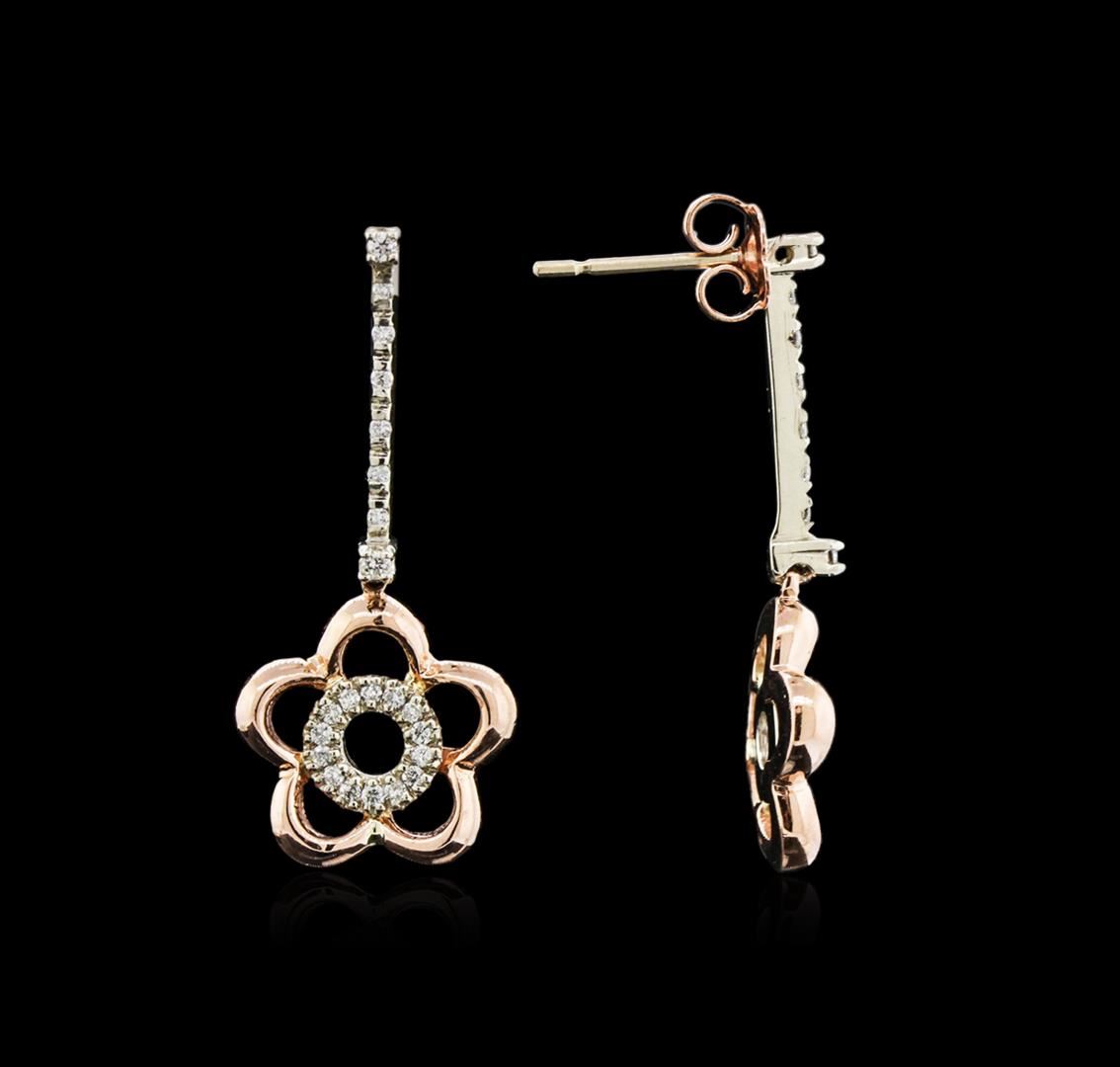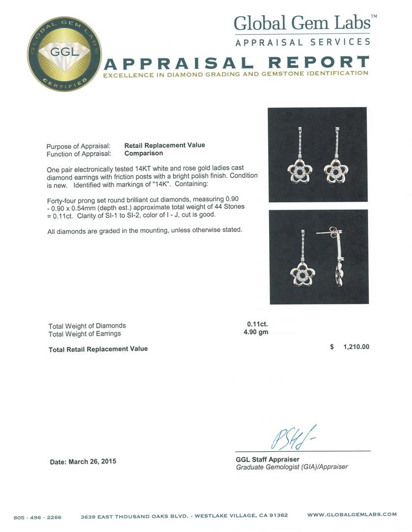 One pair electronically tested 14KT white and rose gold ladies cast diamond earrings with friction posts with a bright polish finish. Identified with markings of "14K". Condition is new. Containing: Forty-Four prong set round brilliant cut diamonds, measuring 0.90 - 0.90 x 0.54mm (depth est.) approximate total weight of 44 Stones = 0.11ct. Clarity: SI-1 to SI-2. Color: I - J, Cut is Good. All diamonds are graded in the mounting, unless otherwise stated. Total Weight of Diamonds 0.11ct. Total Weight of Earrings 4.90 grams. GGL Appraised at $1,210.00.