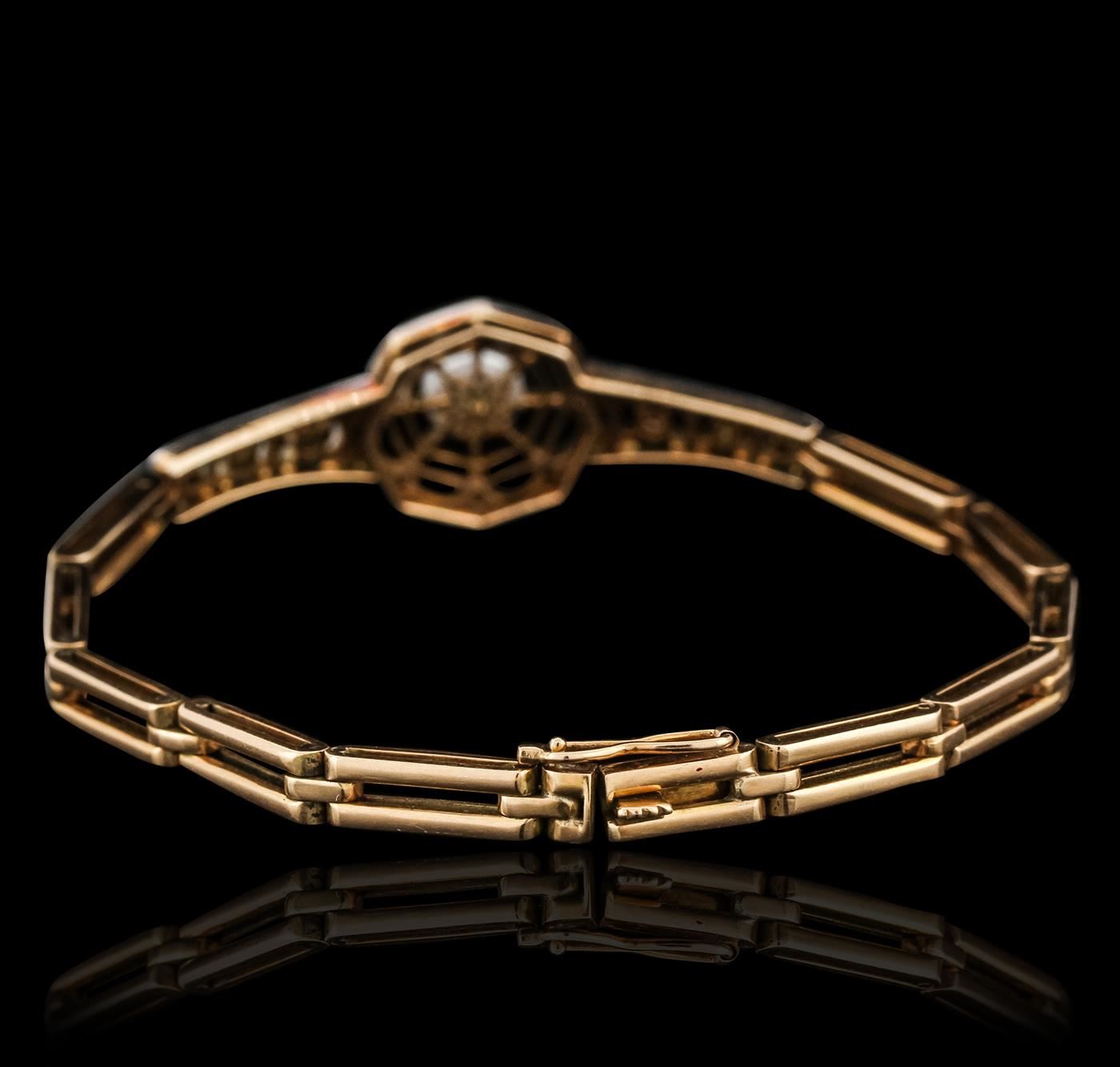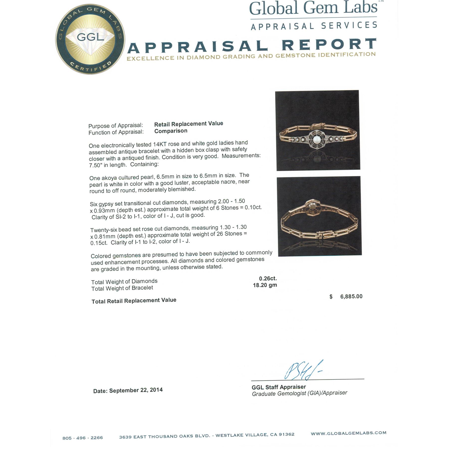 One electronically tested 14KT rose and white gold ladies hand assembled antique bracelet with a hidden box clasp with safety closer with a antiqued finish. Measurements: 7.50" in length. Condition is very good. Containing: One akoya cultured pearl, 6.5mm in size to 6.5mm in size. The pearl is white in color with a good luster, acceptable nacre, near round to off round, moderately blemished. Six gypsy set transitional cut diamonds, measuring 2.00 - 1.50 x 0.93mm (depth est.) approximate total weight of 6 Stones = 0.10 ct. Clarity: SI-2 to I-1. Color: I - J, Cut is Good. Twenty-Six bead set rose cut diamonds, measuring 1.30 - 1.30 x 0.81mm (depth est.) approximate total weight of 26 Stones = 0.15ct. Clarity: I-1 to I-2. Color: I - J. Colored gemstones are presumed to have been subjected to commonly used enhancement processes. All diamonds and colored gemstones are graded in the mounting, unless otherwise stated. Total Weight of Diamonds 0.26ct. Total Weight of Bracelet 18.20 grams. GGL Appraised.