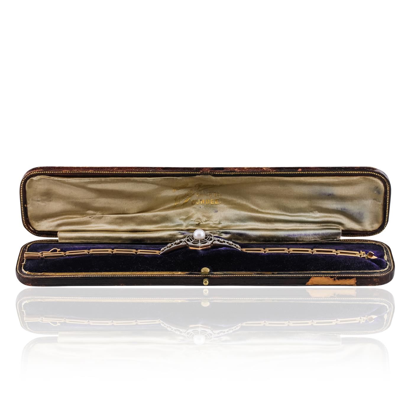 One electronically tested 14KT rose and white gold ladies hand assembled antique bracelet with a hidden box clasp with safety closer with a antiqued finish. Measurements: 7.50" in length. Condition is very good. Containing: One akoya cultured pearl, 6.5mm in size to 6.5mm in size. The pearl is white in color with a good luster, acceptable nacre, near round to off round, moderately blemished. Six gypsy set transitional cut diamonds, measuring 2.00 - 1.50 x 0.93mm (depth est.) approximate total weight of 6 Stones = 0.10 ct. Clarity: SI-2 to I-1. Color: I - J, Cut is Good. Twenty-Six bead set rose cut diamonds, measuring 1.30 - 1.30 x 0.81mm (depth est.) approximate total weight of 26 Stones = 0.15ct. Clarity: I-1 to I-2. Color: I - J. Colored gemstones are presumed to have been subjected to commonly used enhancement processes. All diamonds and colored gemstones are graded in the mounting, unless otherwise stated. Total Weight of Diamonds 0.26ct. Total Weight of Bracelet 18.20 grams. GGL Appraised.